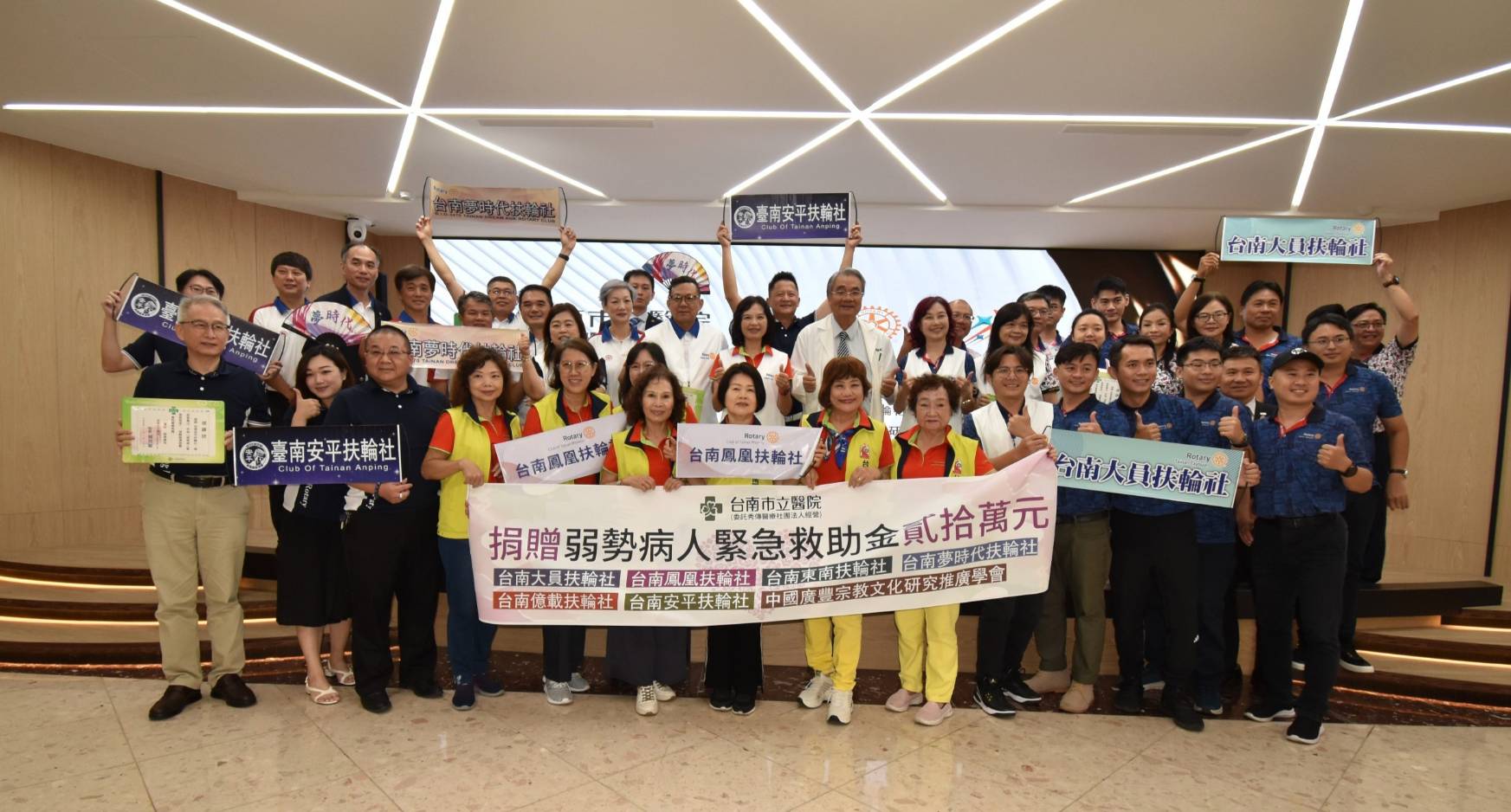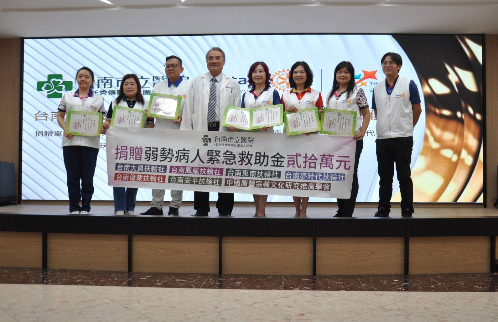 為了減輕弱勢患者的醫療負擔,台南大員扶輪社、台南鳳凰扶輪社、台南東南扶輪社、台南夢時代扶輪社、台南億載扶輪社、台南安平扶輪社,以及中國廣豐宗教文化研究推廣學會共同匯聚愛心力量,捐贈台南市立醫院20萬元「弱勢病人緊急救助」基金,台南市立醫院院長蔡良敏感謝這份溫暖善舉,將專款專用妥善應用基金,讓有需要的個案都能感受到社會的關懷和溫暖。