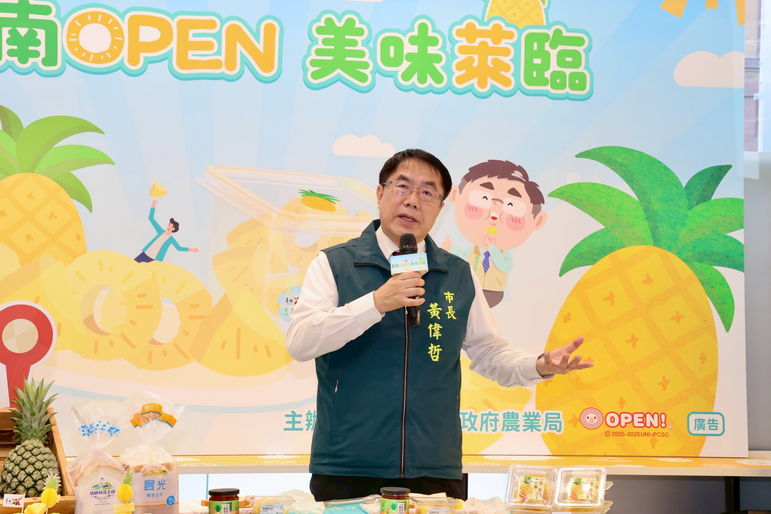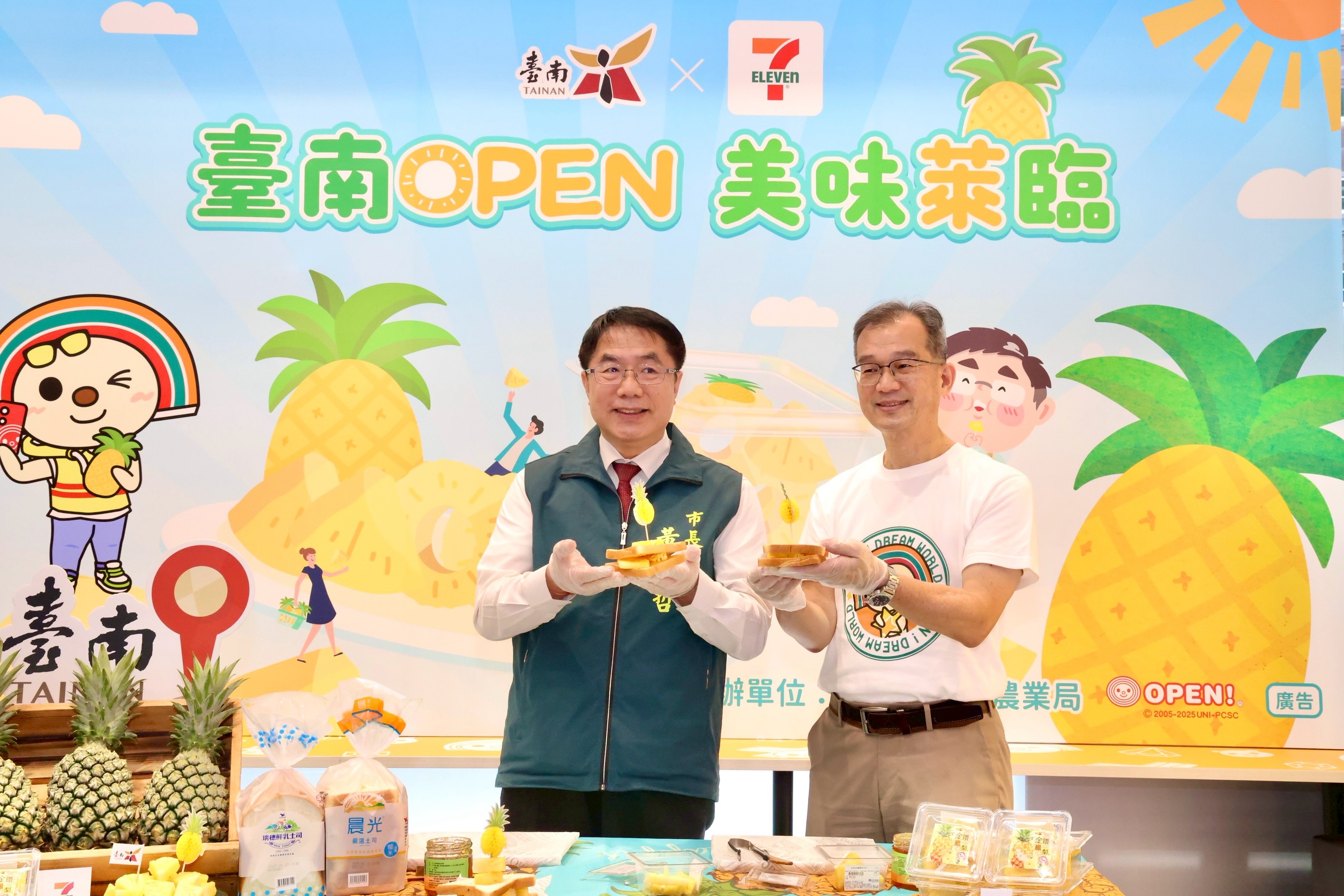 為推廣台南優質農產並強化產地行銷,台南市政府攜手統一超商於今(18)日舉辦「台南OPEN美味萊臨」鳳梨截切鮮果上架記者會,正式宣布台南產地直送的金鑽鳳梨截切鮮果盒,限量上架全台7-ELEVEN門市。台南市長黃偉哲親自出席,推廣在地農民用心栽種的優質水果,邀請消費者一同「吃在地、食當季」,支持台灣農業。