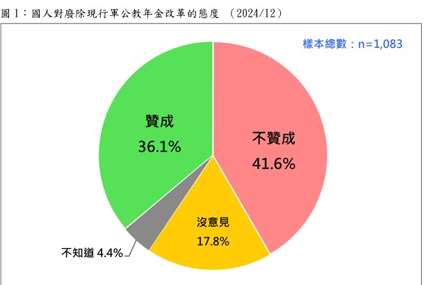 另外,「關於蔡英文政府2018年7月開始的軍公教年金改革,國民黨主張修法「停止遞減退休軍公教所得替代率」,也就是廢除軍公教年金改革。請問您贊不贊成?」結果發現:14.2%非常贊成,21.9%還算贊成,22.6%不太贊成,19%一點也不贊成,17.8%沒意見,4.4%不知道。換句話說,最新民意顯示,二十歲以上台灣人中,三成六贊成廢除軍公教年金改革,四成二不贊成。不贊成比贊成多5.5個百分點。也就是說,目前台灣社會多數民意不支持停止進行中的軍公教年金改革。這項發現傳達了一個清楚訊息,那就是,國民黨力主停止軍公教年金改革,意圖全面翻案,在民意層面是逆勢攻堅,將付出巨大政治代價。