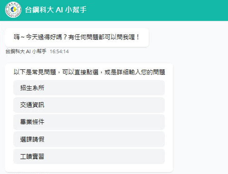 台鋼科技大學將網站首頁增加「台鋼科大AI小幫手」,有直接對話版,也有LINE版,讓學生可以隨時和學校聯繫互動。甚至,台鋼科技大學進一步規劃將從115學年度起,每一個專業科系都將指導學生使用屬於該系所應該會使用的AI工具,跟上國際新趨勢。