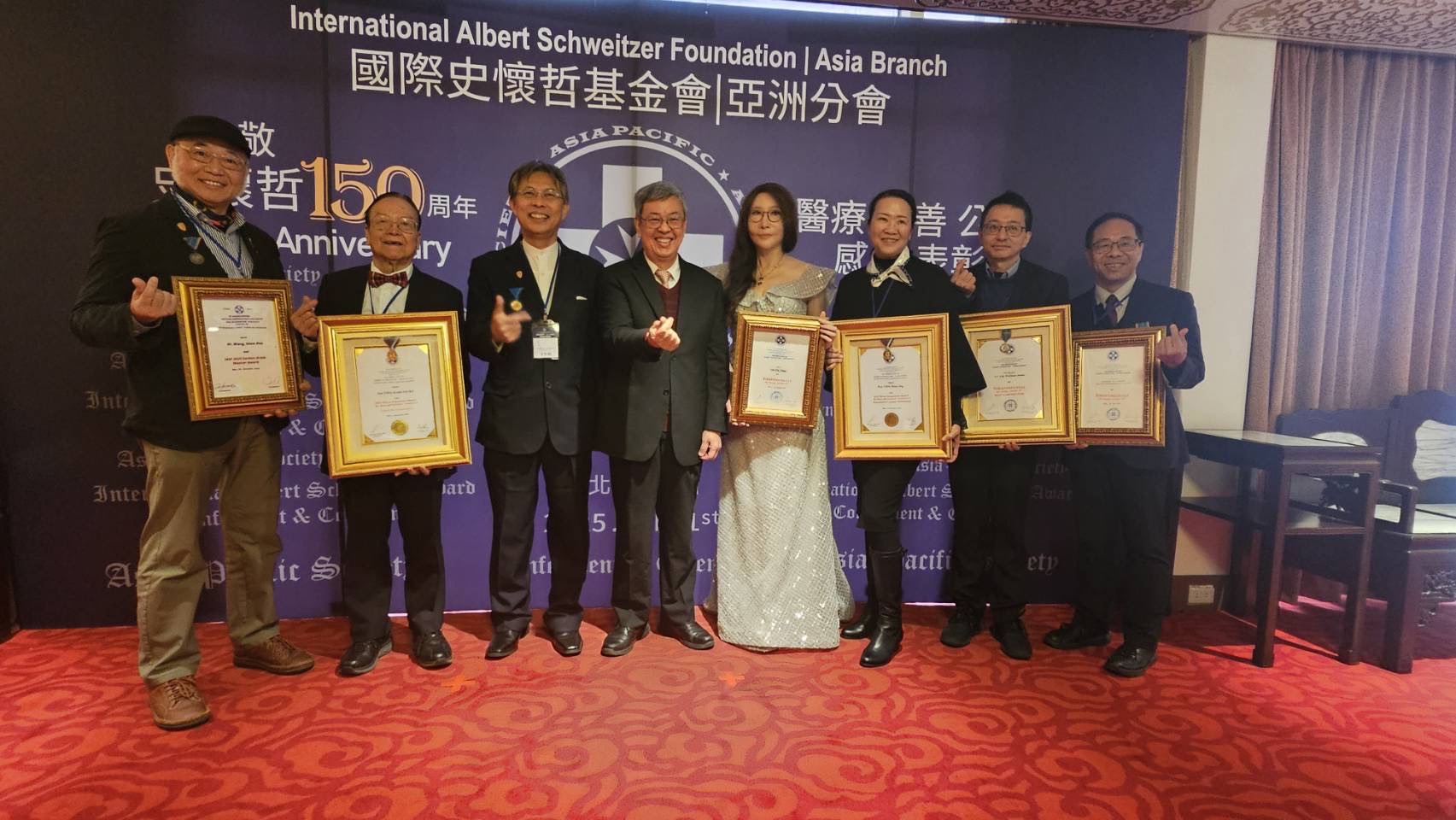 陳建仁院士還頒發了2024年度史懷哲獎章給六位在醫療與慈善領域卓越貢獻的得主,包括陶聲洋防癌基金會董事長陳光耀、珈神咖啡董事長王神寶、艾可益國際董事長趙淇淇、靖心工坊創辦人陳秀靖、順天堂藥廠總經理莊武璋,以及衛生福利部疾管署副署長羅一鈞。