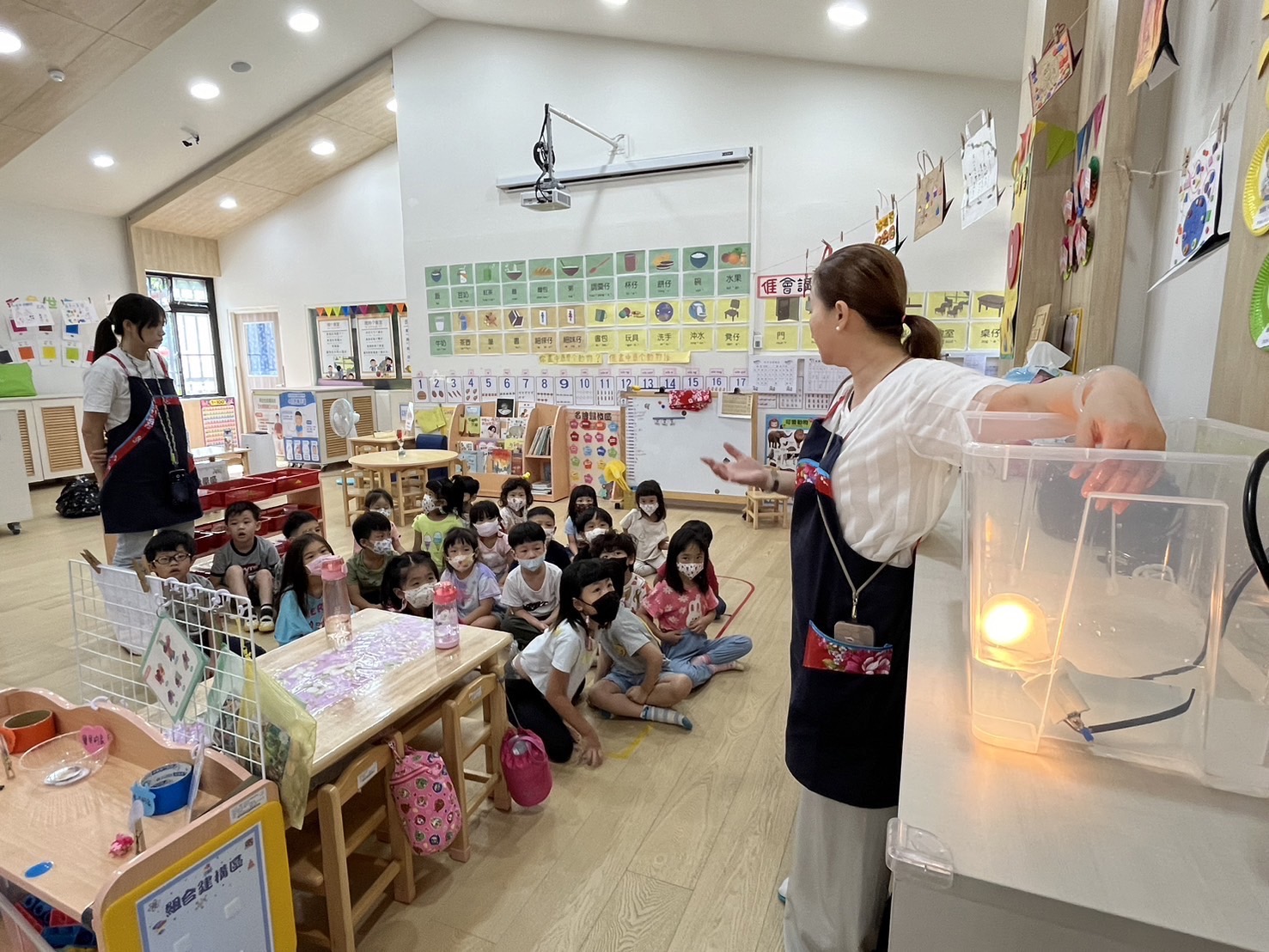 高雄市政府客家事務委員會為呼應2050台灣淨零轉型目標,特別在火焰蟲客語非營利幼兒園安裝漏電科技安全保護裝置系統,將插著電的電燈放進水裡,手伸進水裡竟然不會觸電,孩子驚呼「好奇怪」、「水裡有電,手怎麼不會觸電」等,爭先恐後想試試,神奇極了。