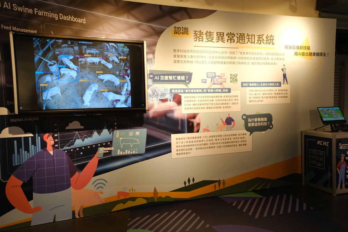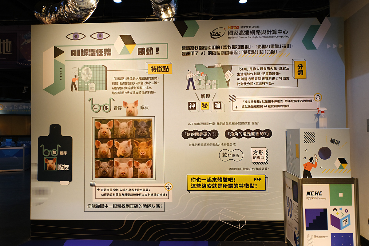 智慧基地-國網中心展出的是與農業科技研究院合作發展的「豬隻異常通知系統」,此系統結合物聯網、AI影像辨識和高效能運算的技術,可以智慧監控豬隻的健康狀態,隨時透過AI了解豬舍情況,提升畜牧場管理的效率,以科技幫助臺灣養豬業進入數位新時代。展區中透過觀察及觸摸的趣味體驗,讓參觀者輕鬆學習AI影像辨識的科普知識,了解人工智慧如何改變傳統畜牧業。