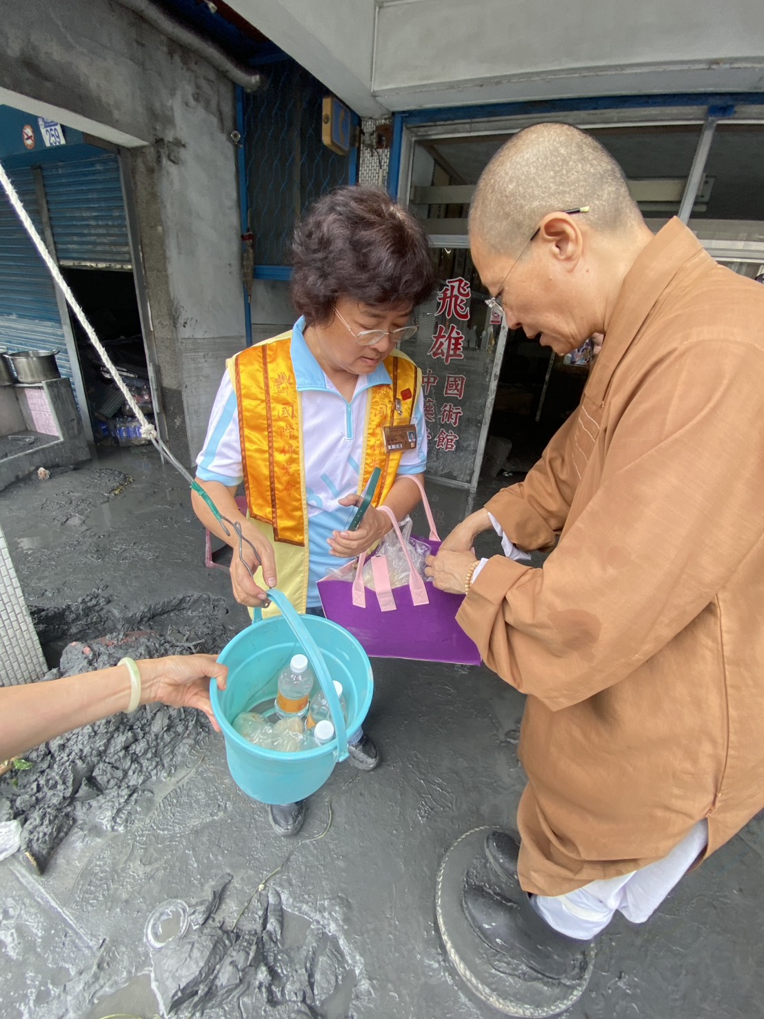 佛光人邱念台督導一家人,也被困在2樓,樓下都是滿地的泥濘。當邱念台的家人看到妙勳法師一行人就出現在樓下時,紛紛感動流淚。法師和佛光人將帶去的飯糰、包子、燒餅、大悲咒水、觀世音菩薩聖像等,放進水桶,用拉繩方式交給邱念台。因無法下樓,彼此透過手機視訊,傳遞關心和祝福。佛光會鄭西華會長的二叔,出生後即在光復居住,今年90幾歲了,也是第一次看到這樣的情況。光復鄉民都知道有堰塞湖的存在,大家都也知道水位升高,總有一天會潰堤,只是不曉得這麼嚴重影響到整個光復鄉。