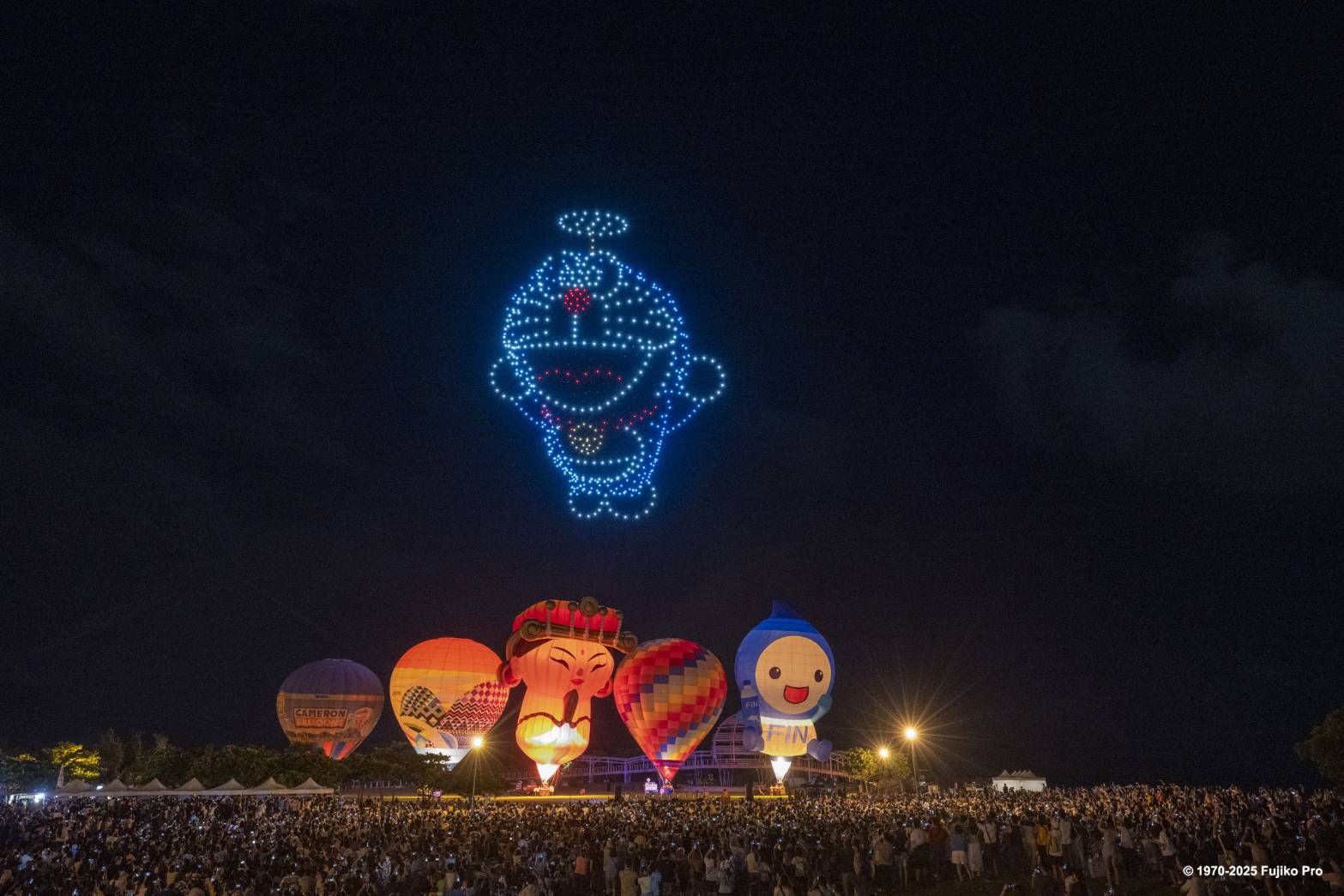 大家最為期待的熱氣球光雕秀則由媽祖球帶領黑松FIN水寶、彩虹球、曙光球及來自泰國的泰神奇等五顆熱氣球結合「哆啦A夢」無人機展演登場,隨著哆啦A夢、大雄、靜香、胖虎與小夫伴隨著耳熟能詳的節奏閃亮登場、耀眼高空煙火秀驚豔全場觀眾,壓軸由全民情歌天后-丁噹深情獻唱鋪陳完美舞台,她以〈猜不透〉、〈洋蔥〉與〈我愛他〉等多首經典情歌,將現場氣氛推向浪漫與感動的最高點,觀眾在歌聲中隨之沉醉。