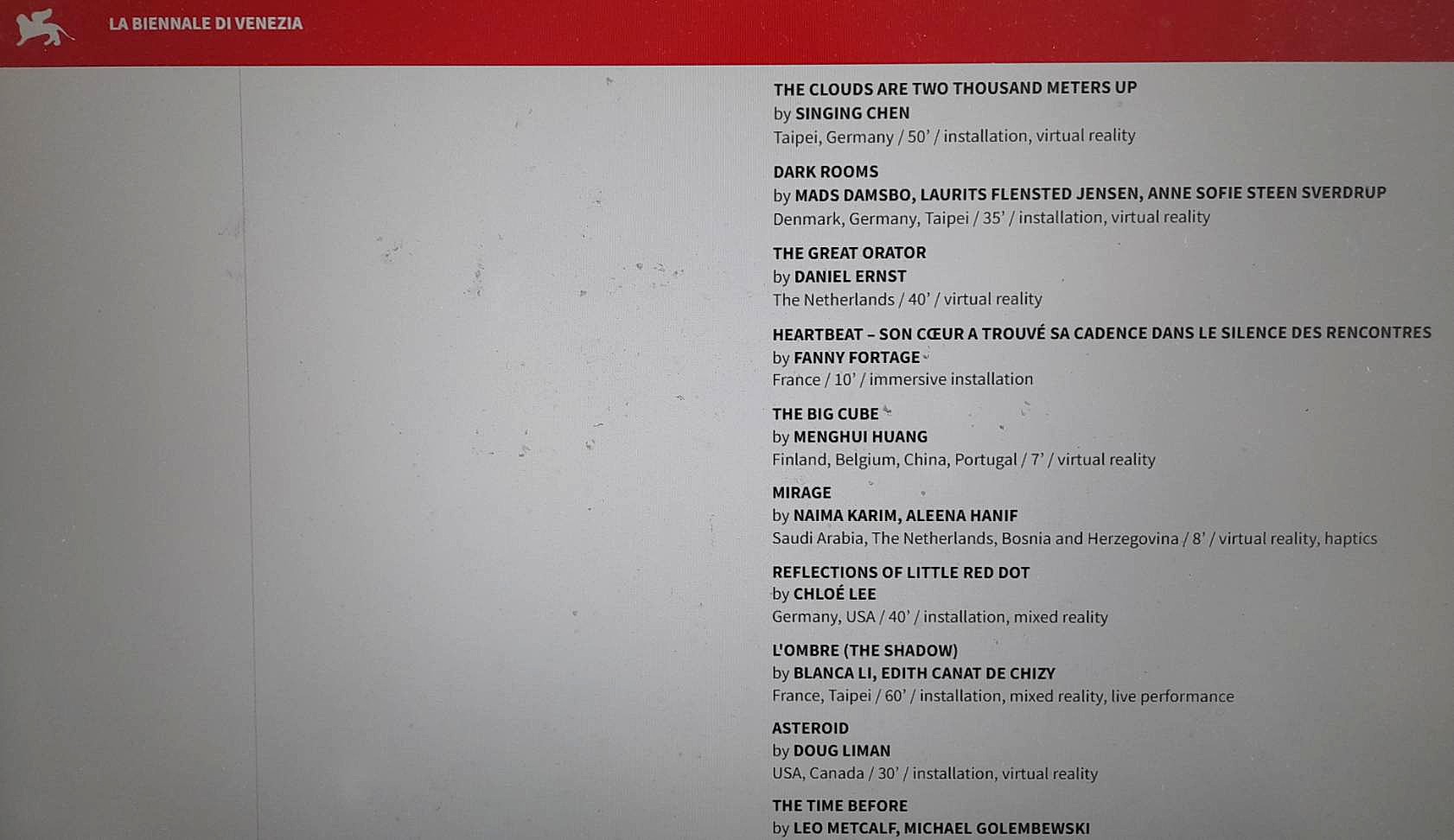 台灣影像作品近來傳出好消息,2022年威尼斯影展Venice Immersive競賽最佳沉浸式作品獎得主陳芯宜導演今年以VR新片“雲在兩千米”再次入圍威尼斯影展沈浸式作品競賽,葉信萱導演作品《Sense Of Nowhere》及台法合資的「陰影」(l’Ombre)也入圍同一競賽。謝文明導演的台港合資動畫短片「螳螂」(Praying Mantis)則入圍威尼斯影展地平線短片競賽(Orizzonti Short Films International Competition).