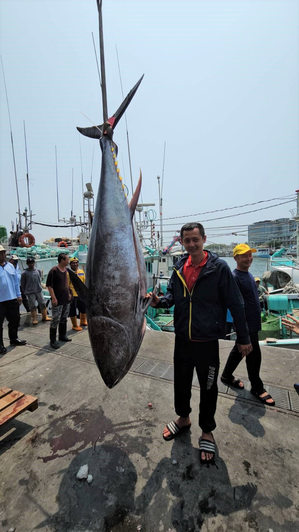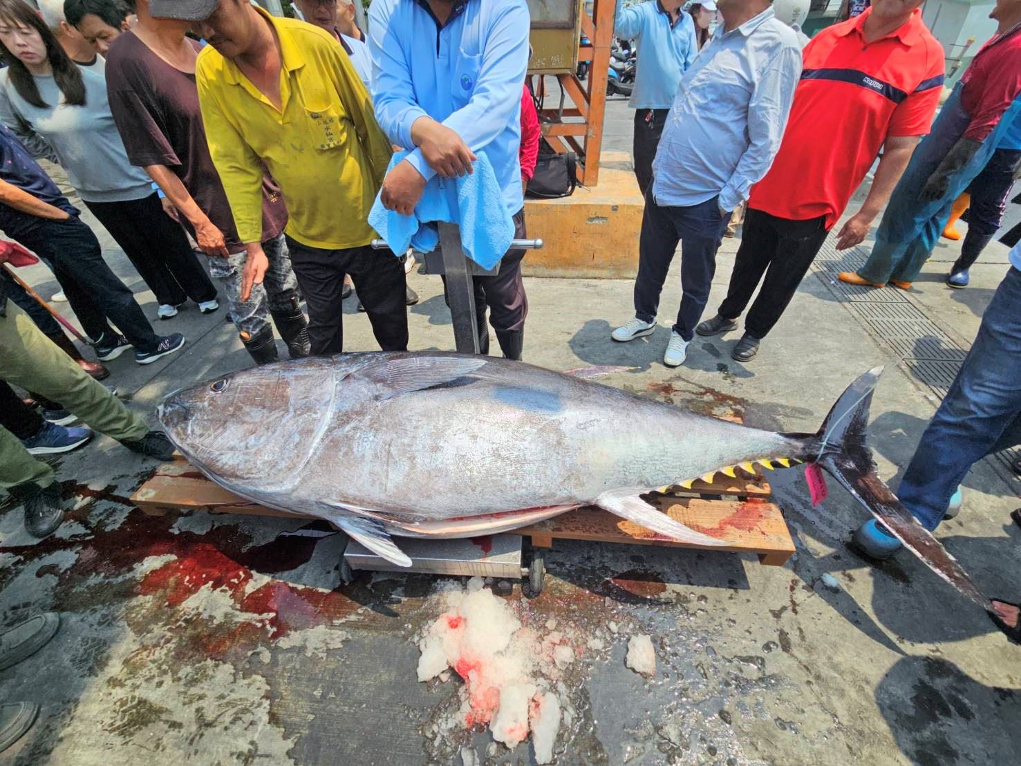 今年第一鮪現身報到,「茂豐祥號」於4月6日通報東港漁業電台,當天凌晨零點19分在北緯 20度50分,東經122度48分台灣東南方海域捕獲一尾公黑鮪,目視估約210公斤以上,為爭第一鮪頭銜,東港籍船長陳睿豪火速返港,於今日清晨4時50分返抵東港,並由東港區漁會安排舉辦驗魚活動。