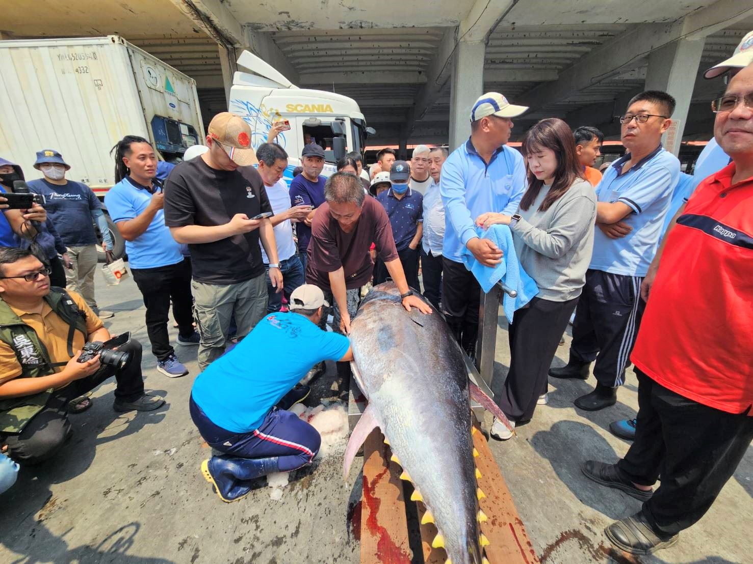 2025屏東東港第一鮪報到!東港漁業電台於6日凌晨接獲東港籍漁船「茂豐祥號」通報,在台灣東南方海域捕獲一尾公黑鮪魚,7日在東港舉行「驗魚」活動,確認符合起鉤活魚、捕撈海域、重量超過180公斤且第一個返港,由東港籍漁船茂豐祥號奪得今年「第一鮪」資格,屏東縣政府與東港區漁會預計在11日舉辦第一鮪拍賣會。