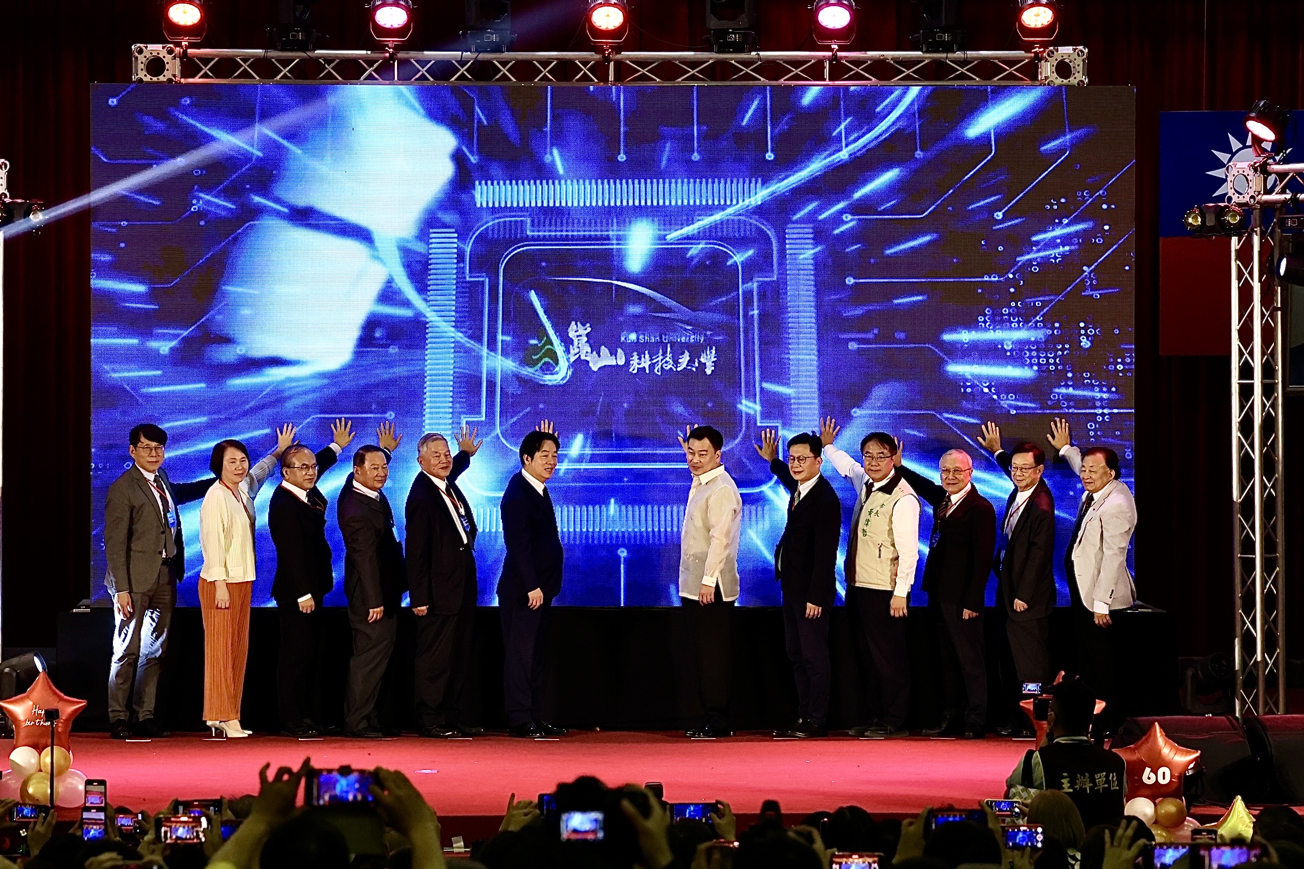 崑山科技大學今(12)日舉行「電動車晶片模組及充電樁研發製造人才培育基地」啟用典禮,正逢創校60週年校慶,臺南市長黃偉哲也受邀,與賴清德總統、總統府資政沈榮津、教育部政務次長張廖萬堅、交通部政務次長陳彥伯、立法委員林俊憲、林宜瑾、陳亭妃、王定宇等貴賓,共同見證南部首座電動車專業培訓場域啟用。