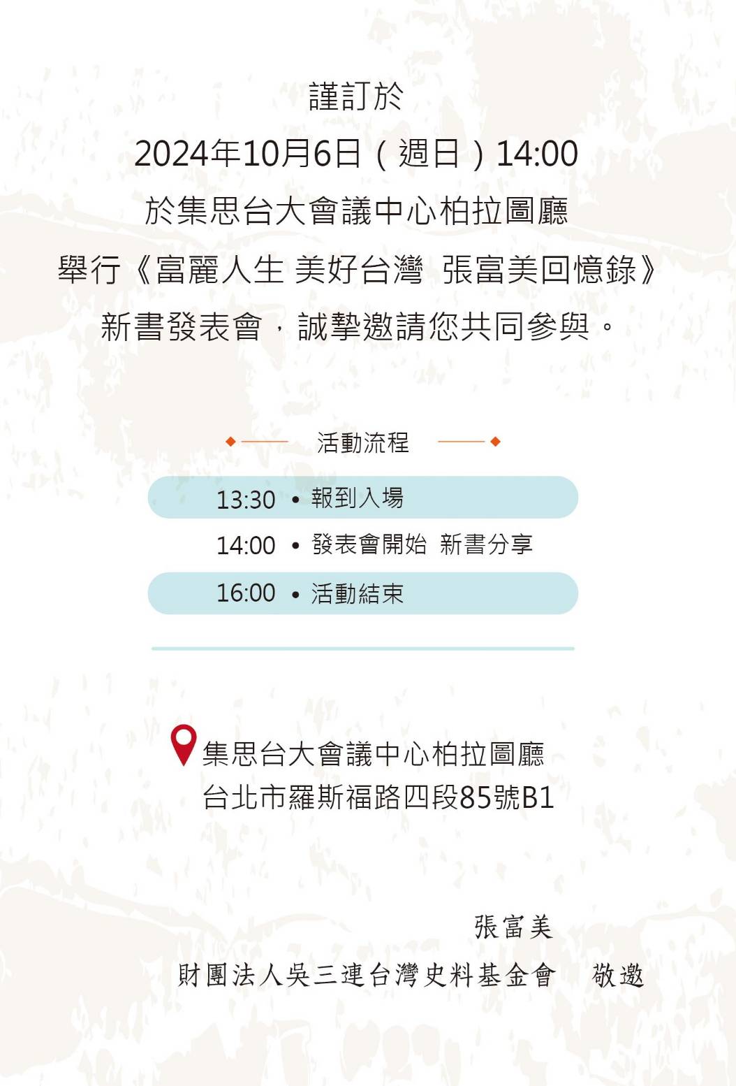 時間:2024年10月6日(週日)14:00(13:30 報到入場)