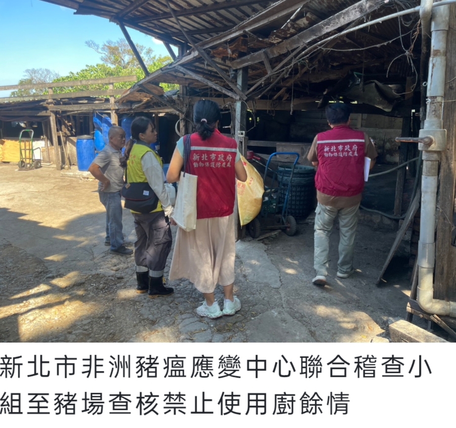 市府應變中心平時自主巡查新北市養豬場皆未有異常情形,10月22日台中疫情發生,隨即啟動聯合稽查小組清查本市107間養豬場,偕同新北市養豬協會協助66場廚餘養豬廠停止使用廚餘及添購飼料餵飼,確認廚餘流向及處理廚餘銷毀回收。此外,運豬車輛全面啟動管制措施,利用GPS運豬車管制系統線上即時監控車輛移動軌跡,23日0時起聯合警察局全面管制禁止運豬車輛載運及進入本市。