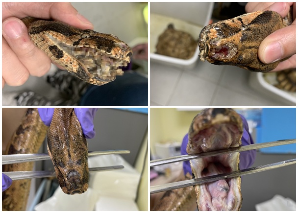 這隻紅尾蚺體長約兩公尺,經動保處毛寶貝醫療中心獸醫師檢查後,發現其頭部有明顯傷口,且傷口已遭蠅類產卵並長滿蛆蟲,口腔亦腐爛化膿長蛆,伴隨大量口腔分泌物等明顯呼吸道感染症狀。經診斷,其頭頂的傷口,極有可能為該動物長期居住在過於狹小的空間,吻端反覆磨傷後因環境衛生等問題造成感染後引發。獸醫進行清創、抗生素治療與傷口護理,紅尾蚺在妥善醫療照顧下逐漸康復,目前已恢復進食與活力並上架動保處官網公告招領,經過七天公告期飼主仍未前來領回,將媒合幫紅尾蚺另覓新家。
