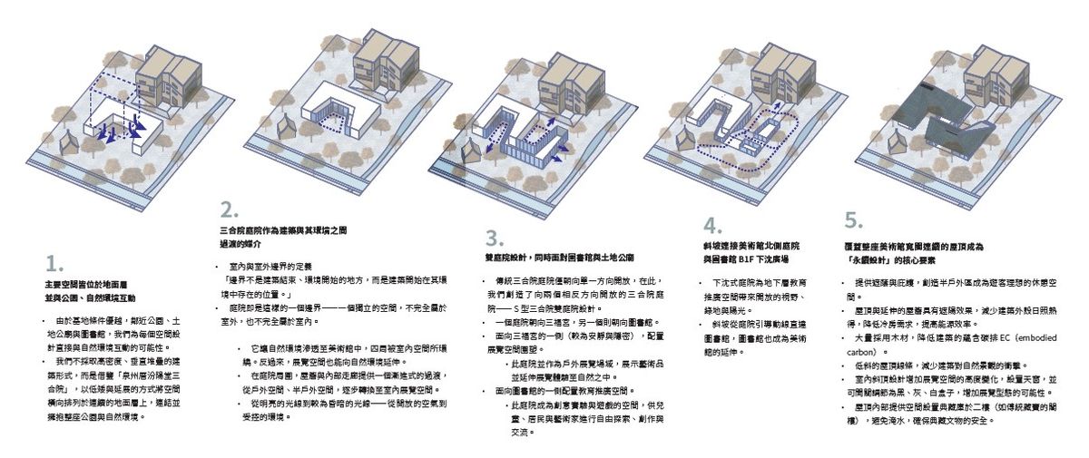 台灣傳統民居的形式-三合院,蘊含「共居共享」的生活哲理,竹間建築團隊還將這項文化基因轉換為建築巧思,當作空間主軸意理,象徵人群與藝術的交匯平台。別於表象挪用的仿古設計,此案強調的是空間關係重新詮釋,三翼佈局成就彼此對話,凸顯展覽、創作、教育與交流等多元機能,以自然光引導動線,使得光影如時間的語言,在牆面與屋簷間潺潺流動。