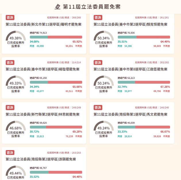 7案包括新北市第11選區羅明才、新竹縣第2選區林思銘、台中市第2選區顏寬恒、台中市第3選區楊瓊瓔、台中市第8選區江啟臣、南投縣第1選區馬文君,以及南投縣第2選區游顥。7立委罷免案全數否決。
