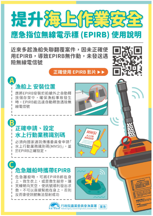 有鑑於此,海洋局要呼籲漁民朋友,希望出海作業前,記得探查作業水域海象資訊,檢查漁船船體及漁船上之設備如救生艇(筏)、救生衣及滅火器等是否能正常使用,以及雷達、緊急無線電示標(EPIRB)、自動辨識系統(AIS)等設備儀器確認是否能正常運作。再次提醒漁民朋友,海上作業期間務必穿著救生衣,為生命及財產再多添一分保障。