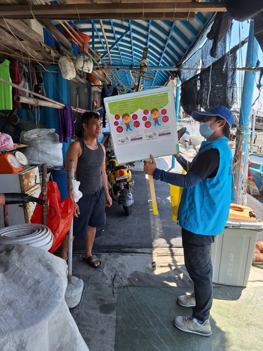 此外,颱風豪雨過後的積水環境也容易成為病媒蚊孳生溫床,增加登革熱傳播風險。為防範登革熱疫情的發生及擴散,海洋局持續向外籍漁船員進行衛教宣導,內容涵蓋辨識登革熱症狀、避免積水容器孳生病媒蚊、船艙清潔注意事項等,並發放英文、印尼文、菲律賓文等多語版防疫資料,協助外籍船員克服語言障礙,充分理解防疫重點。