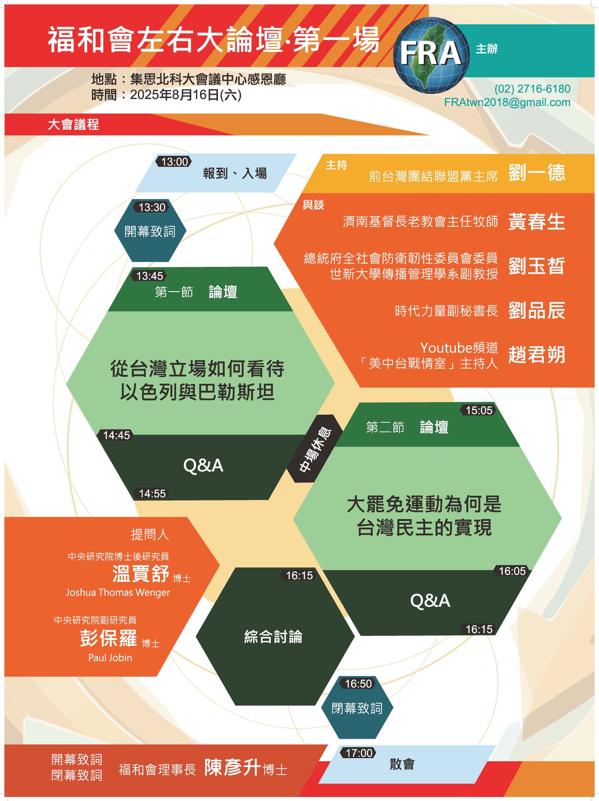 福和會左右大論壇將於2025年8月16日(六)13:00-17:00在集思北科大會議中心感恩廳(近捷運忠孝復興站,台北市大安區忠孝東路三段1號億光大樓2樓)舉行,活動免費參加,現正開放線上報名,名額有限,額滿為止。報名請洽02-2716-6180,或直接填寫線上報名表:https://forms.gle/MqdC21Rkc38SHFXBA