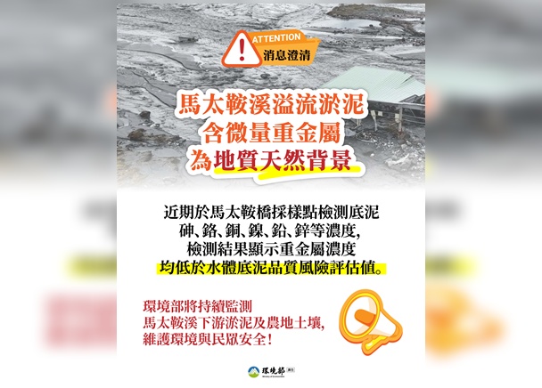 環境部澄清近日媒體報導馬太鞍溪堰塞湖溢流後大量淤泥沖刷下游,引發民眾關注重金屬議題。環境部指出,馬太鞍溪上游地質分類屬虎頭山片岩,形成土壤為淡灰色,有高度滑膩感,馬太鞍溪沖下的淤泥,其母岩性質原本就含有微量重金屬,屬地殼天然背景造成,非人為污染,請民眾不必擔心。