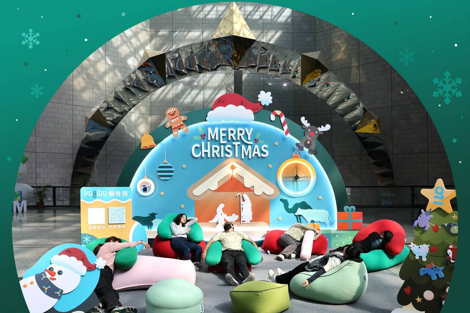 今年1F大廳以大型拱形TRUSS聖誕主視覺為核心,結合柱子上的聖誕老公公高掛迎賓,搭配雪花全息投影裝置,隨光影流轉閃耀空間,成為民眾爭相拍照的熱門打卡點。現場更設置Yogibo懶骨頭休憩區,柔軟多樣的造型座椅,讓親子家庭在參觀之餘,能自在坐臥、伸展放鬆,享受片刻悠閒時光。不少學校團體也特地安排學生到館參訪,在聖誕布置前留下歡樂合影。