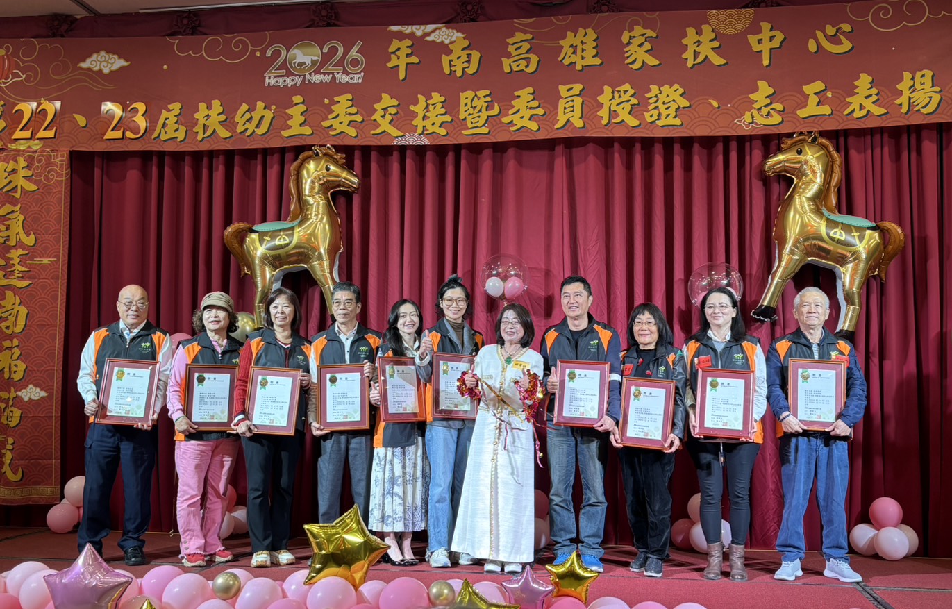 南高雄家扶中心於今(10日)假南北樓林森店辦理「珠氣蓬勃扶滿載,綺開得勝贏未來」第22、23屆扶幼主委交接及委員、志工幹部授證暨歲末聯誼活動。現任主委莊月珠將身上象徵力量、前進、榮耀、承諾等配件,由新任主委賴曼綺一一穿戴上身,並且在家扶基金會謝武吉監事、周大堯執行長、高雄市政府社會局葉玉如副局長,以及全體扶幼委員的見證之下,正式接任南高雄家扶中心第23屆扶幼主委一職。