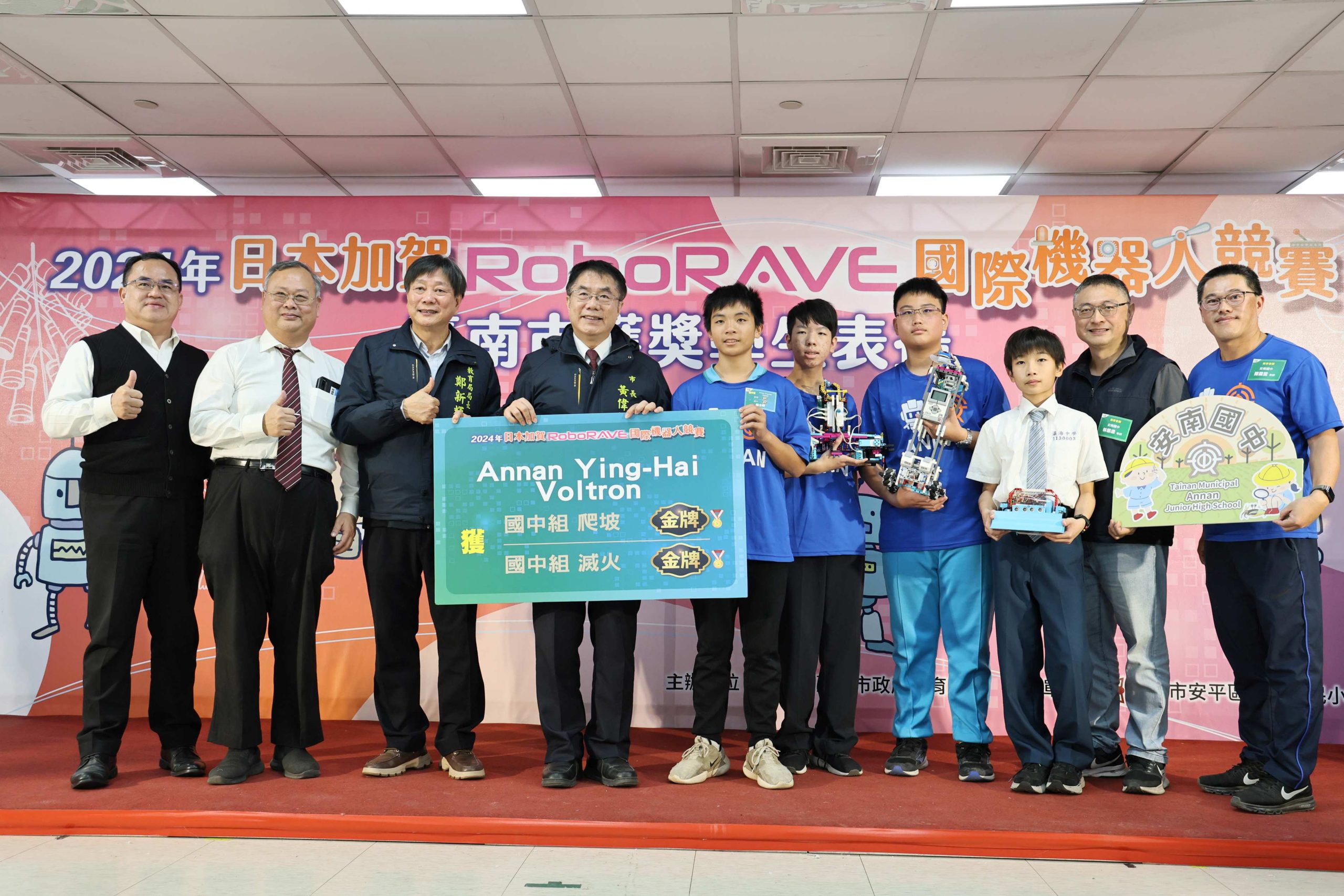 市府教育局說明,「RoboRAVE國際機器人大賽」於去(113)年11月15日到17日在日本石川縣加賀市舉行,參賽選手來自日本、中國、智利、埃及、墨西哥等國,總共超過1千名選手,可謂競爭激烈。臺南代表隊學生以卓越表現,榮獲10金、8銀、10銅共計28面獎牌,在全部45面獎牌中,囊括近三分之二,其堅強實力不僅是臺南之光,更是為臺灣之光。