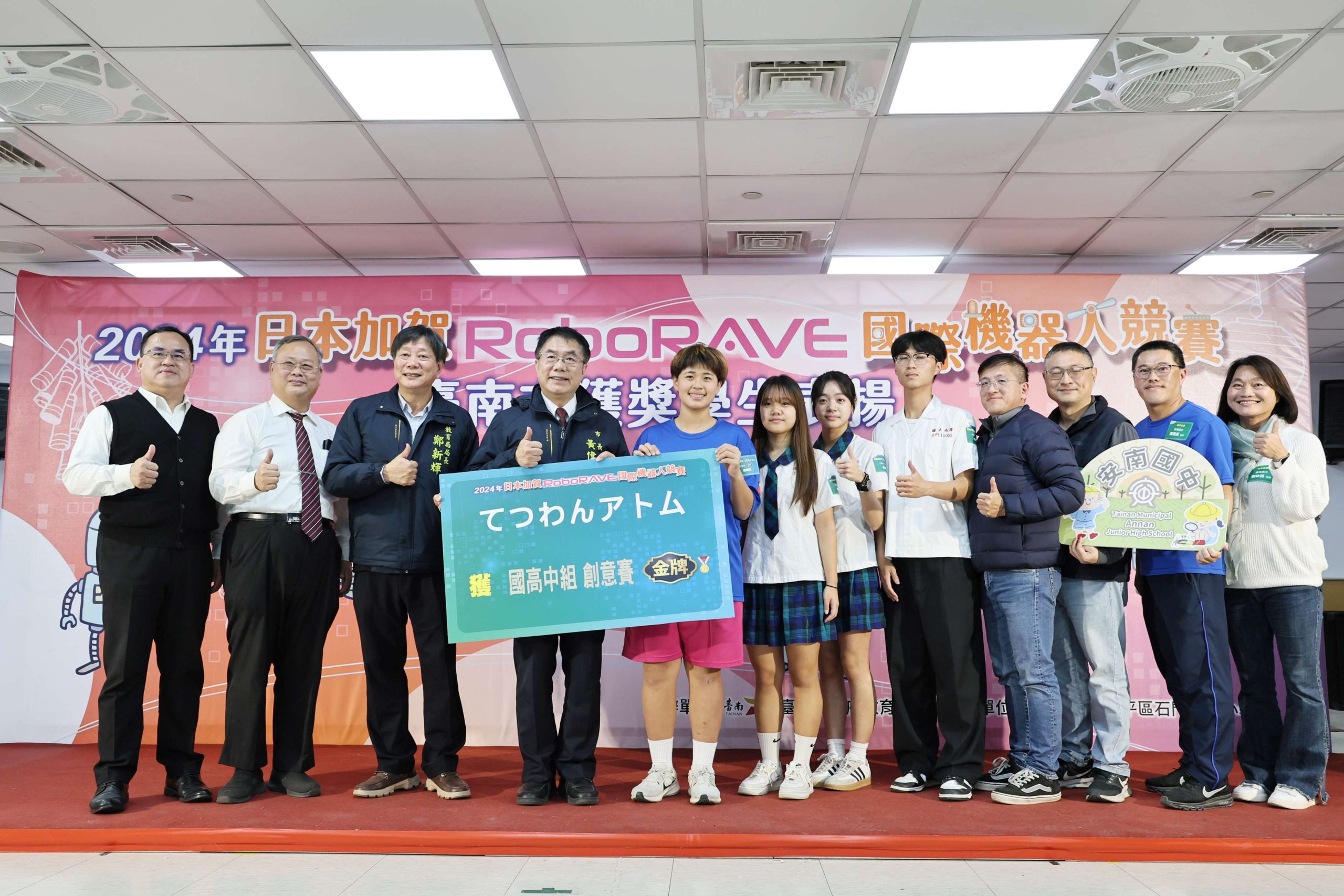 臺南市代表隊參加去(113)年11月參加在日本舉辦「RoboRAVE國際機器人大賽」,在強敵環伺下,榮獲28面獎牌,囊括總獎牌數近三分之二,成績優異。市長黃偉哲今(3)日親自表揚獲獎學生,對其卓越表現給予高度肯定,期待學子們努力不懈,未來成為科技業的頂尖人才,讓臺灣科技產業持續在世界舞台發光發熱。