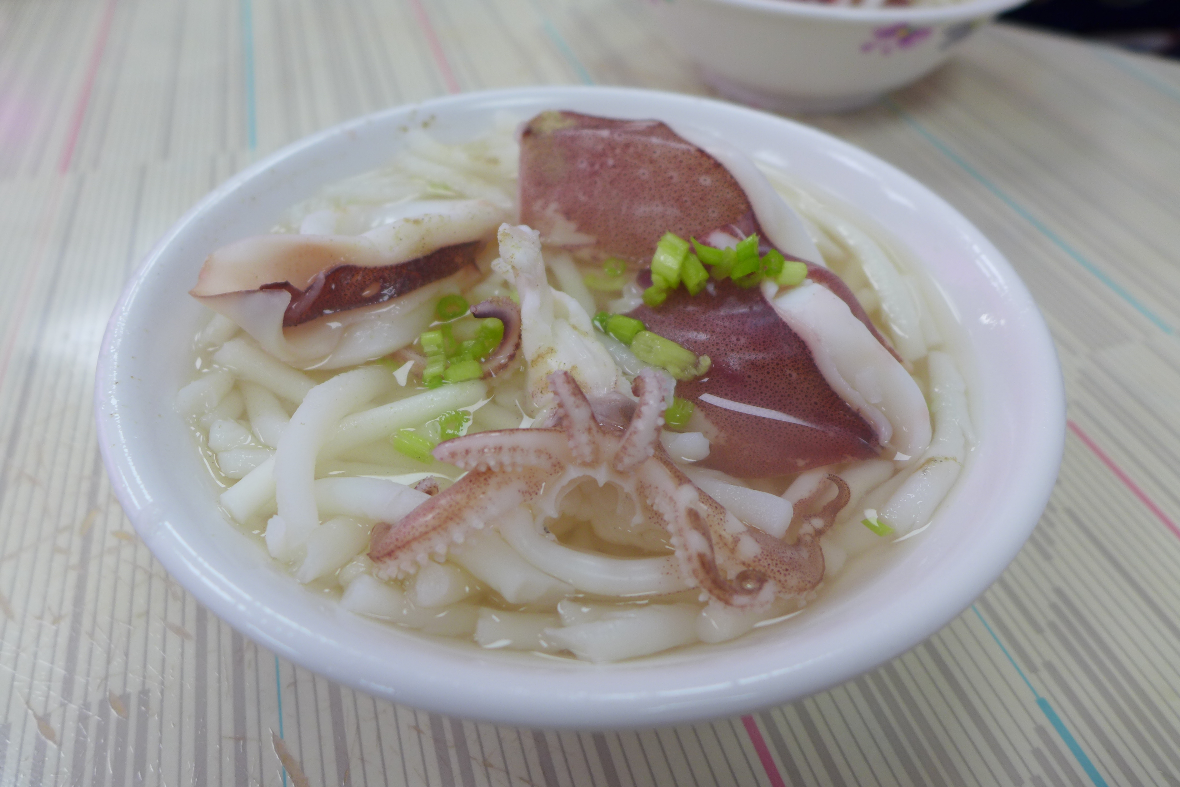 我便讓他們下車加入長龍。我和內人去找停車位,在過了2個路口的地下停車場停好車,走回店裡,M夫婦已排到前面。老闆看他們是日本人特別安排冷氣比較強的位子給我們。「葉家小卷米粉」的特色是小卷肥大新鮮,一碗切一隻,滿滿一碗,吃來確實過癮,米粉反而是配料。