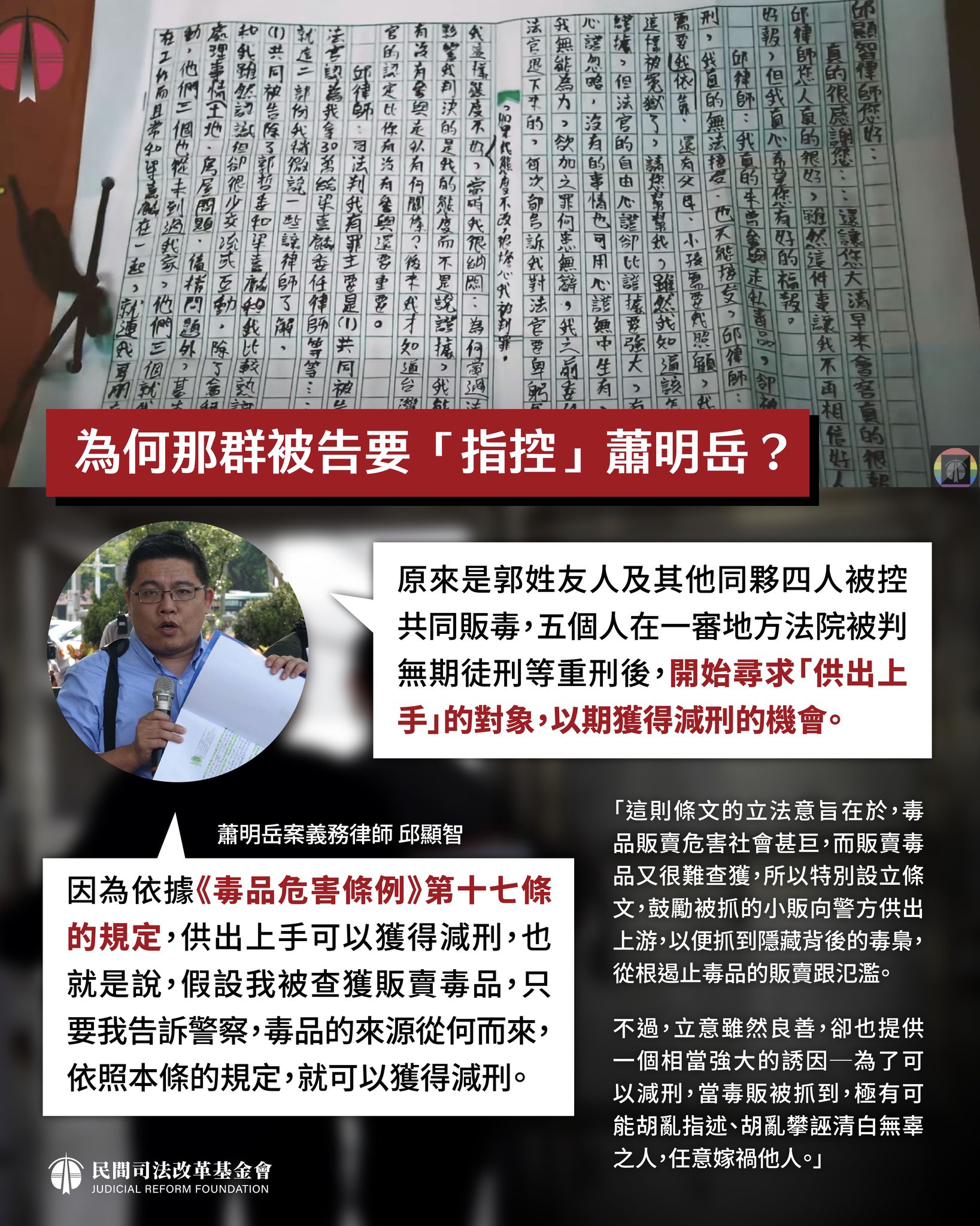 邱顯智進一步指出,早在2011年宋雲仙在會客時,就告訴友人宋雲華講出的人有人是冤枉的,這些人後來在地院被判刑後,就希望用毒品危害防制條例第17條規定,「供出毒品來源,因而查獲其他正犯或共犯者,減輕或免除其刑」,利用宣判後坐囚車回台中看守所的路上進行串證,咬出蕭明岳是主謀,果然後來在高等法院判決時,5人中除郭哲委,其餘4人都因供出上手獲減刑。