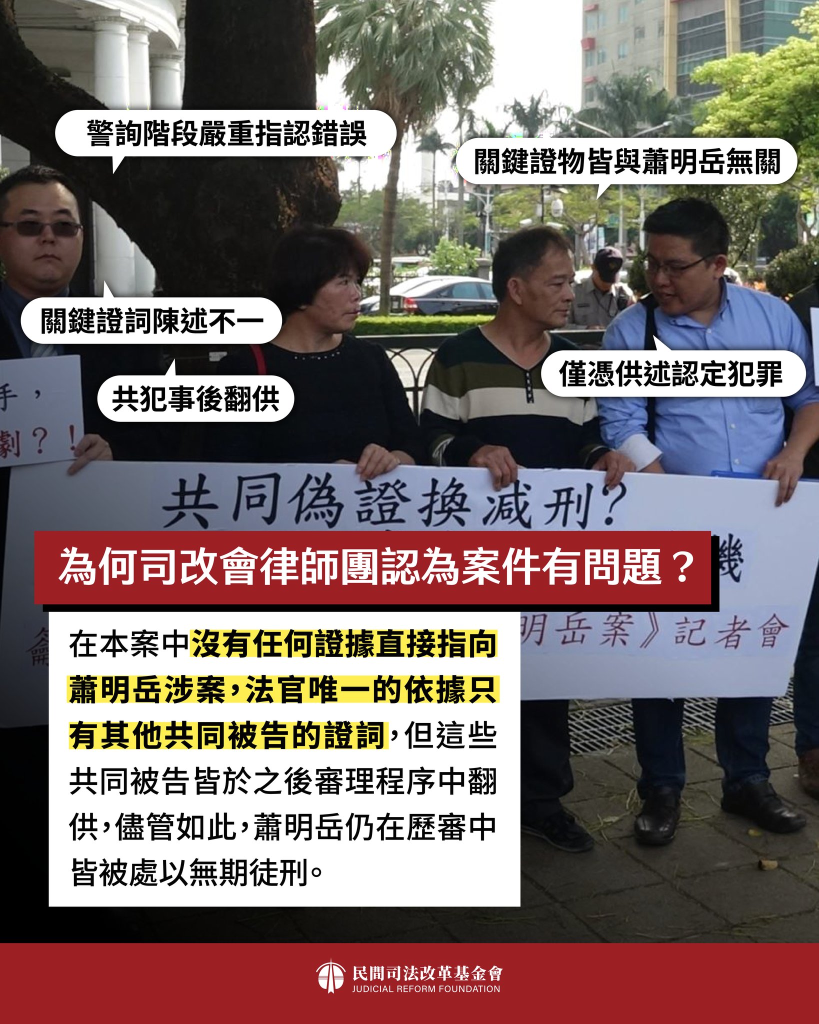 甚至,本案除了檢察官偵查中有疑似不正訊問、誘導本案的證人外,認定蕭明岳有罪的關鍵證詞也前後矛盾,且證人也在事後翻供,寫信給法官說蕭明岳是無辜的。即便如此,蕭明岳仍在最高法院2013年1月駁回上訴後,無期徒刑確定。