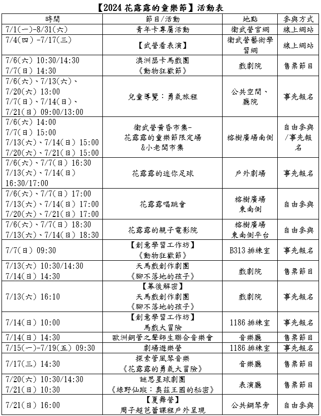 【2024花露露的童樂節】活動表。(圖/衛武營國家藝術文化中心提供)