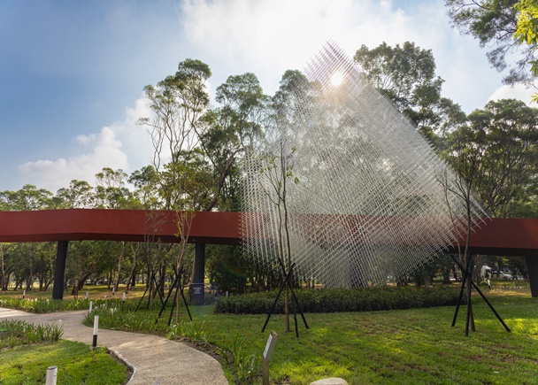 除展廳人潮絡繹不絕,建築景觀及公共藝術更成為熱門打卡點。林局長說明,國家檔案館選址林口,紅色漸層烤漆玻璃帷幕除代表林口臺地紅土沉積,也象徵檔案堆疊保存珍貴的國家記憶;此外,建物僅占基地1/4面積,保留3/4自然演替次生林,結合鄰近林口運動公園形成都市綠帶,創造自然與人文共生景緻。