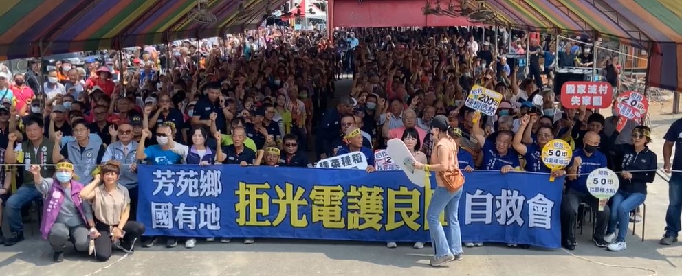 彰化縣環境保護聯盟號召近千名彰化芳苑鄉民發起連署國有地,周三(7日)聚集草湖保安宮廣場「拒光電 護良田」。彰化縣環境保護聯盟指出,芳苑鄉將近600公頃的國有地良田,已有光電業者向國有財產署取得開發同意函,近日有部分廠商要召開規劃興建地面型光電場說明會,芳苑鄉代表會全數通過「拒光電 護良田」,號召鄉親一起來守護芳苑鄉國有地良田!!「芳苑國有地拒光電護良田自救會」表示,芳苑鄉國有農地約有1100甲,集中在草湖地區,國有財產局核發5家能源公司的太陽能光電開發同意函,已威脅到農民生計。