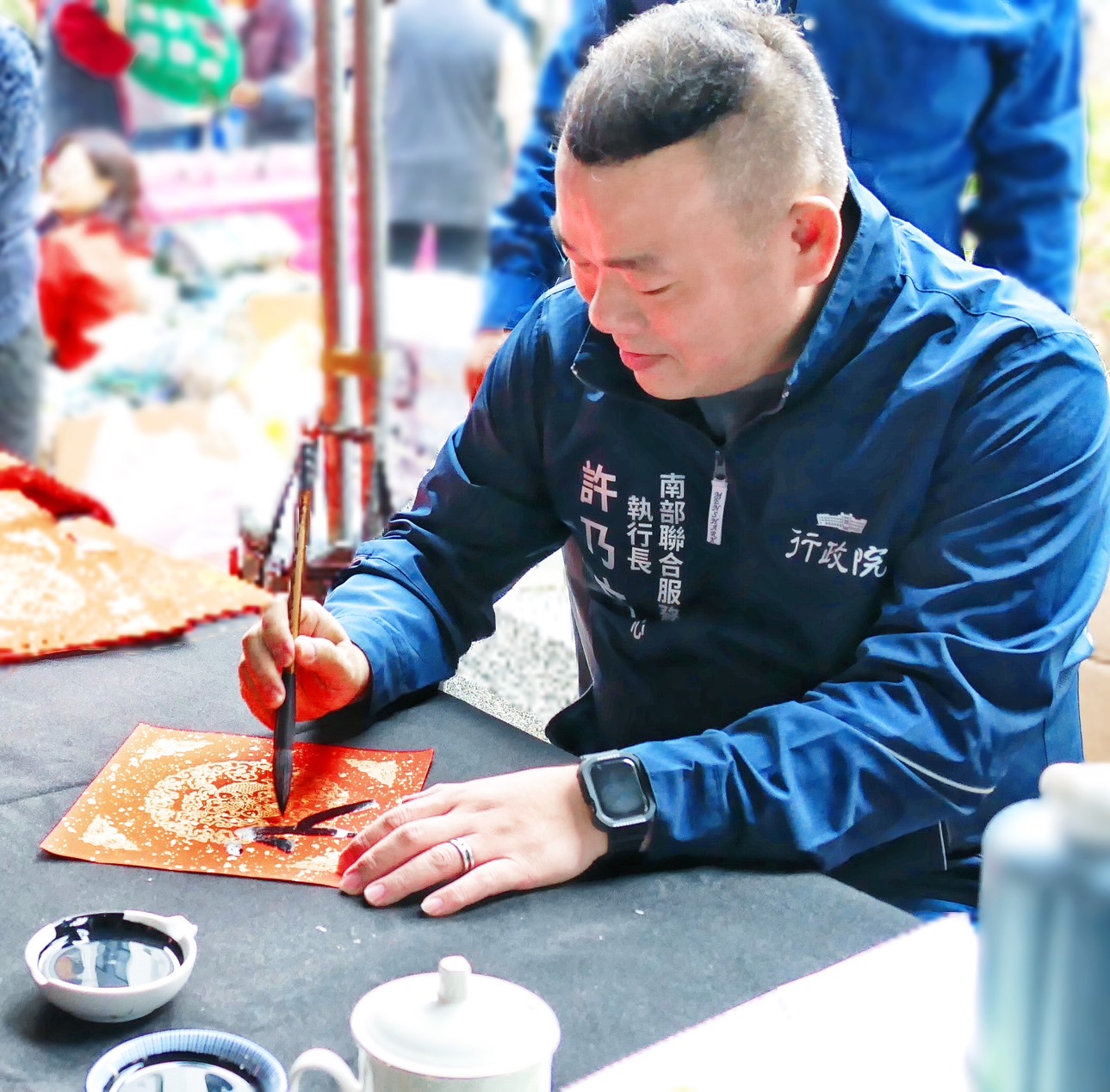 行政院南部聯合服務中心許乃文執行長表示,春節活動已成為南服中心的重要年度傳統,深受民眾喜愛。最近三年,南服中心每年都會結合不同的客家傳統技藝,呈現出各種新風貌,目的就是希望將客家文化、傳統和客語,進一步推廣給民眾。今年邀請南部五位知名書法家- 藍進士、蔡武勳、楊壽雲、蔡典成及夏萬春老師現場揮毫春聯,為鄉親送上滿滿的新春祝福。