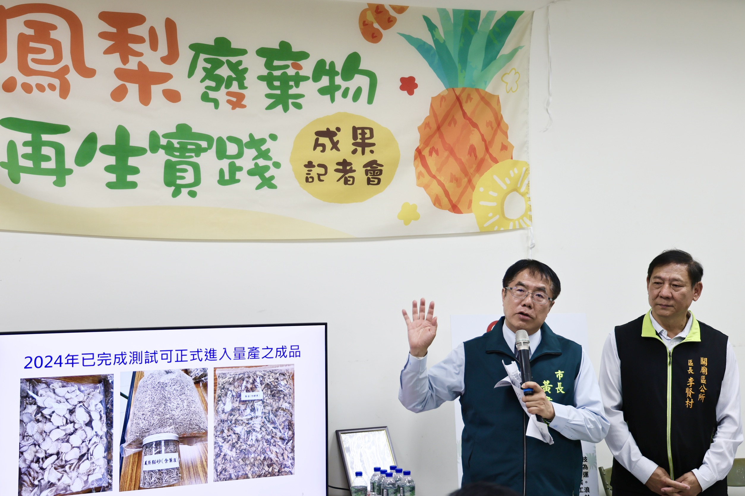 為配合國家政策,達成2040年農業淨零排放目標,台南市政府持續推動低碳農業,透過「減量」、「增匯」、「循環」、「綠趨勢」等策略,積極促進農業轉型。市府農業局、關廟區公所攜手晉億實業股份有限公司,今(19)日於關廟果菜市場倉庫舉辦「鳳梨廢棄物再生實踐成果記者會」,說明鳳梨廢棄物的最新再生利用模式及其帶來的經濟與就業效益。