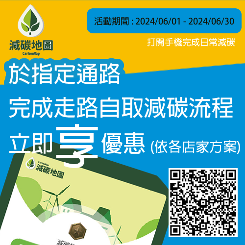該活動是透過記錄使用者走路取餐、購買惜食商品以及使用循環杯…等減碳行為,給予使用者減碳點數,於消費時可作為折扣優惠使用,也歡迎一般市民踴躍參加,響應環保ESG愛地球。消費者可以點擊 減碳地圖,用LINE帳號即可開始累積減碳點數:(https://reurl.cc/aqWZRD) 或是掃描下方QRCODE。