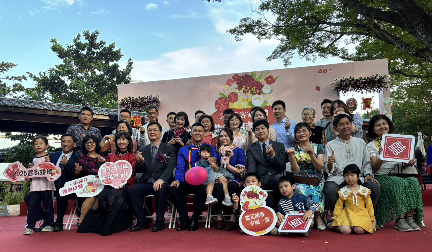高雄市新客家文化園區昨(29)日化身為浪漫綠廊,雨豆樹步道在冬陽映照與繽紛盤花的襯托下格外耀眼。步道兩側以象徵圓滿與祝福的「油紙傘」雅緻布置,為新人們輕輕鋪上滿載祈願的幸福之路。21對新人在親友及數百名民眾的見證中完婚,現場滿溢溫暖祝福與濃厚文化韻味。