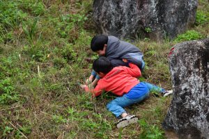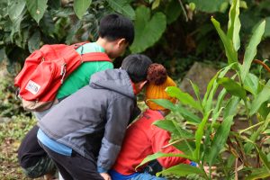 撐著傘蹲在水邊看,趴在草地上找,把葉子湊近眼睛細細端詳。沒有人提醒孩子們「要有好奇心」,一雙雙靈動的眼睛,從踏進自然的那一刻,學習就已經開始了。