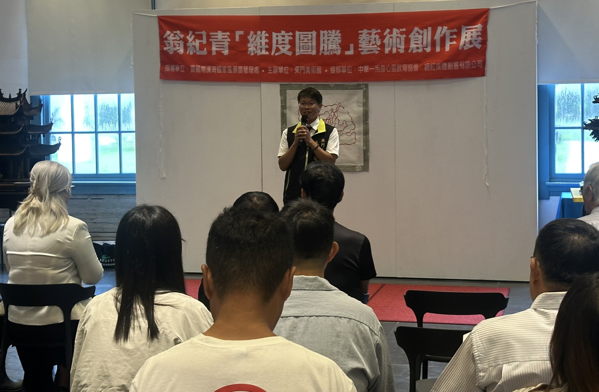 接續著一連串的來賓介紹與致詞,有東門美術館創辦人卓來成、北門區區長林建男、勞工局蔡旺庭專門委員、新榮高中董事長胡學貴、藝術家李國殿,另藝術家陳榮修、王玫琪伉儷也致贈一幅靈運荷蝦圖給東美館三館,還有臺南市商業總會吳國禎總裁,最為特別的祝賀就是來自台中霧峰林家宮保第國藝術中心總會總院長林品陞!