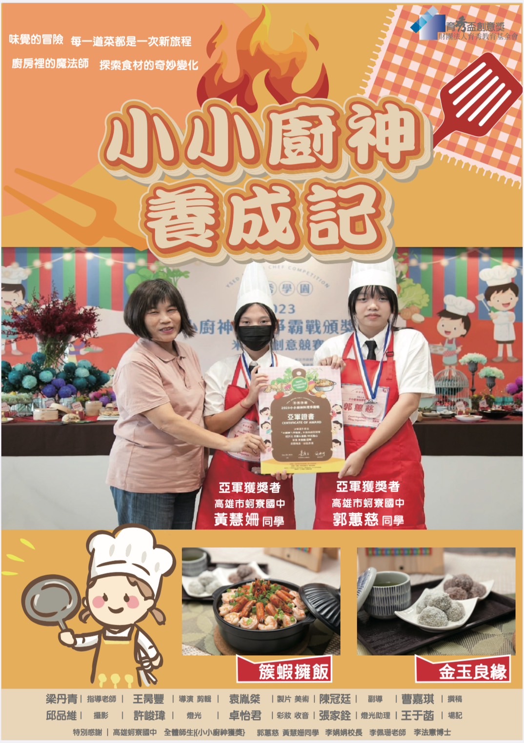 這2部片子分別是「愛的灌溉」、「小小廚神養成記」。獲得銀獎的「愛的灌溉」中除了食農教育,內容更結合了「反霸凌」議題的題材,搭上教育部最近重大修正的「校園霸凌防制準則」,頗具創意。另外獲得微電影佳作的「小小廚神養成記」主角是黃慧姍同學、郭蕙慈同學,他們同時也參加2023小小廚神料理爭霸戰以「食當季、吃在地」的理念為主軸獲得亞軍,他們將努力過程拍成微電影以展現食育教育成果。