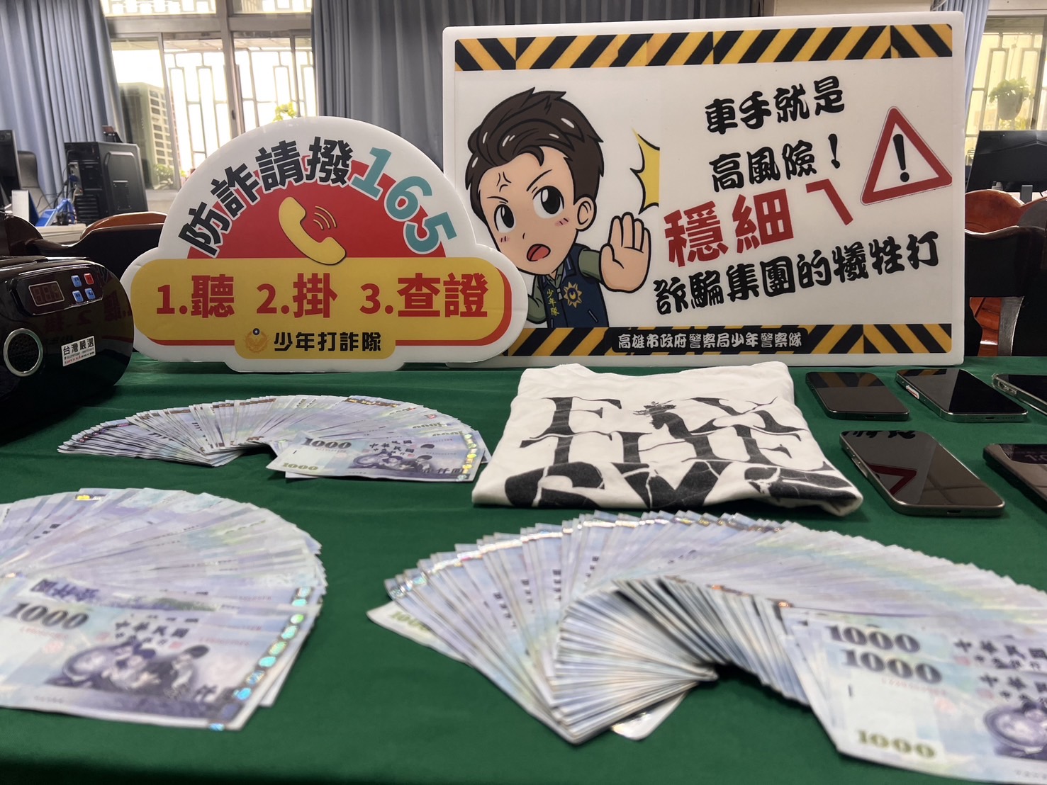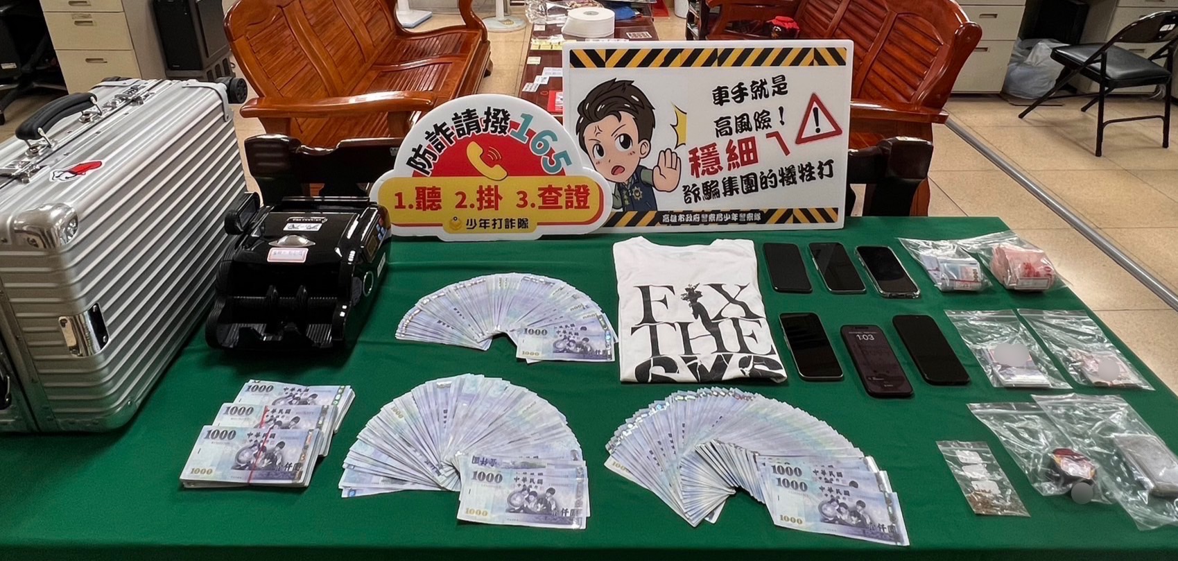 高市警局少年警察隊於11月21日打擊詐欺集團,破獲以張姓嫌疑人為首的詐欺車手集團,於犯嫌住處查扣現金新台幣65萬餘元、點鈔機、第二級毒品大麻、手機及涉案穿著白色上衣等證物,經移送高雄地檢署偵辦,並持續溯源查緝詐騙集團。