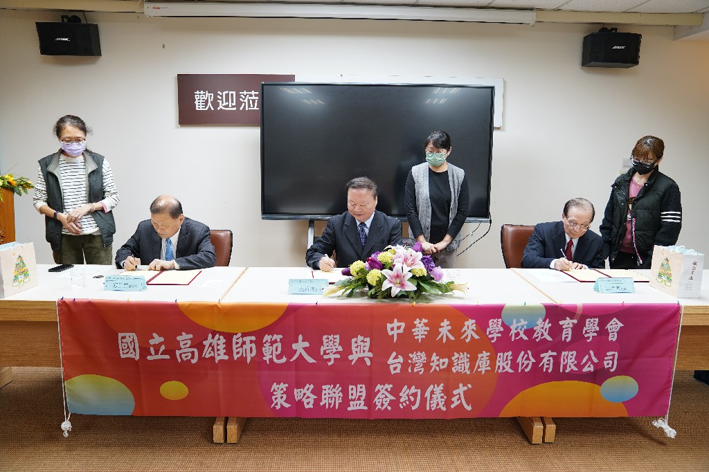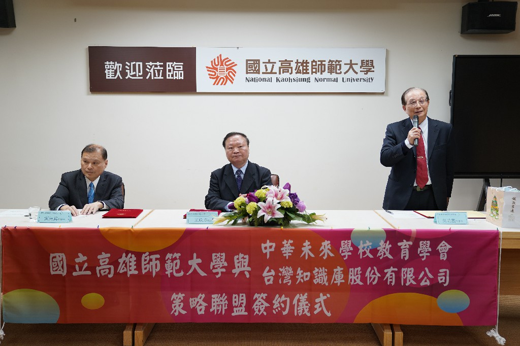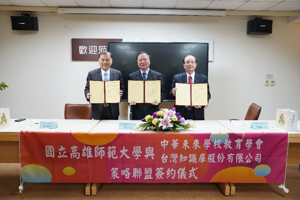 國立高雄師範大學於今(11)日上午11時,假和平校區行政大樓五樓簡報室,攜手中華未來學校教育學會與台灣知識庫股份有限公司簽署策略聯盟,共同推動教育創新與學術交流,促進教育發展與知識共享,並藉此深化教育與科技的結合,培育未來所需人才。