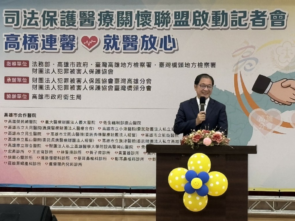 為保障犯罪被害人就醫權益,高雄市政府與財團法人犯罪被害人保護協會臺灣高雄分會與臺灣橋頭分會,聯合高雄多家公私立醫療院所,推動司法與醫療跨域合作聯盟,提供犯罪被害人就醫免除掛號費的補助措施。高雄市市長陳其邁今(20)日與法務部部長鄭銘謙及犯保協會共同出席啟動記者會,期能健全擴大醫療服務網,讓犯罪被害人受到最好的照顧。