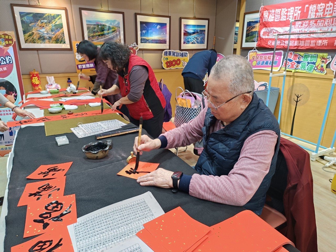 春節連假即將到來,高雄區監理所選在今(21)日除夕前1個禮拜,邀請中華民國書學會南區分會的書法老師前來大展身手,親筆揮毫寫春聯,送給前來監理所參與互動同樂的民眾。