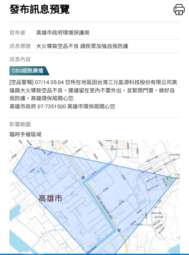 高雄市環保局並發布[空品警報] 的簡訊通知:您所在地區因台灣三元能源科技股份有限公司高雄廠大火導致空品不良。建議留在室內不要外出,並緊閉門窗,做好自我防護。環境部及環保局關心您.[Air quality alert]The level of air quality concern is very unhealthy. Please stay indoors. MOEPA。(07)7351500