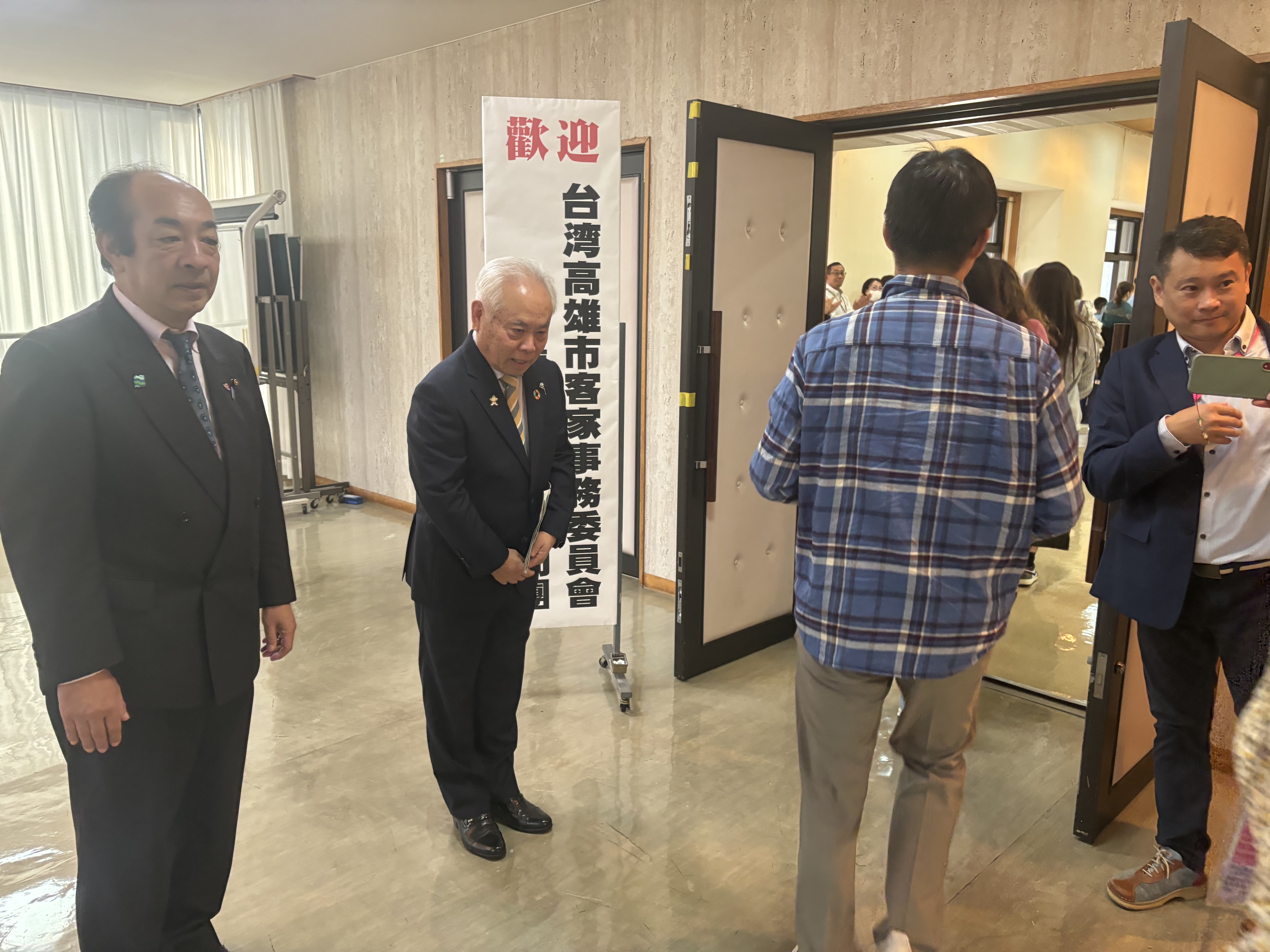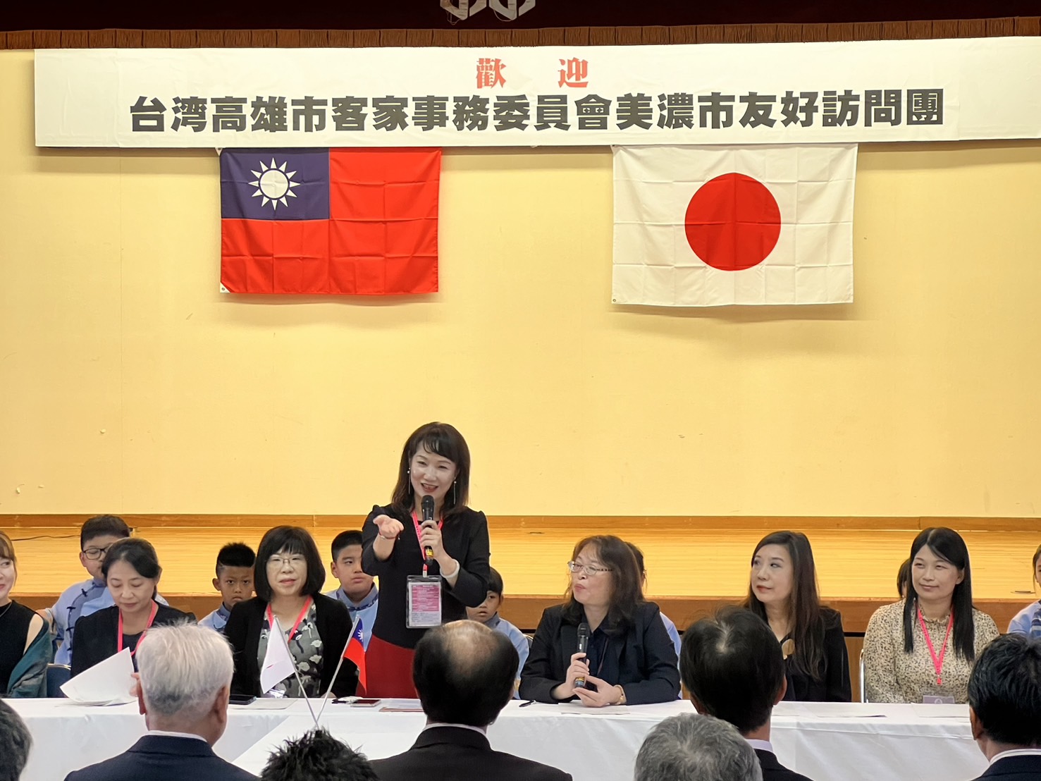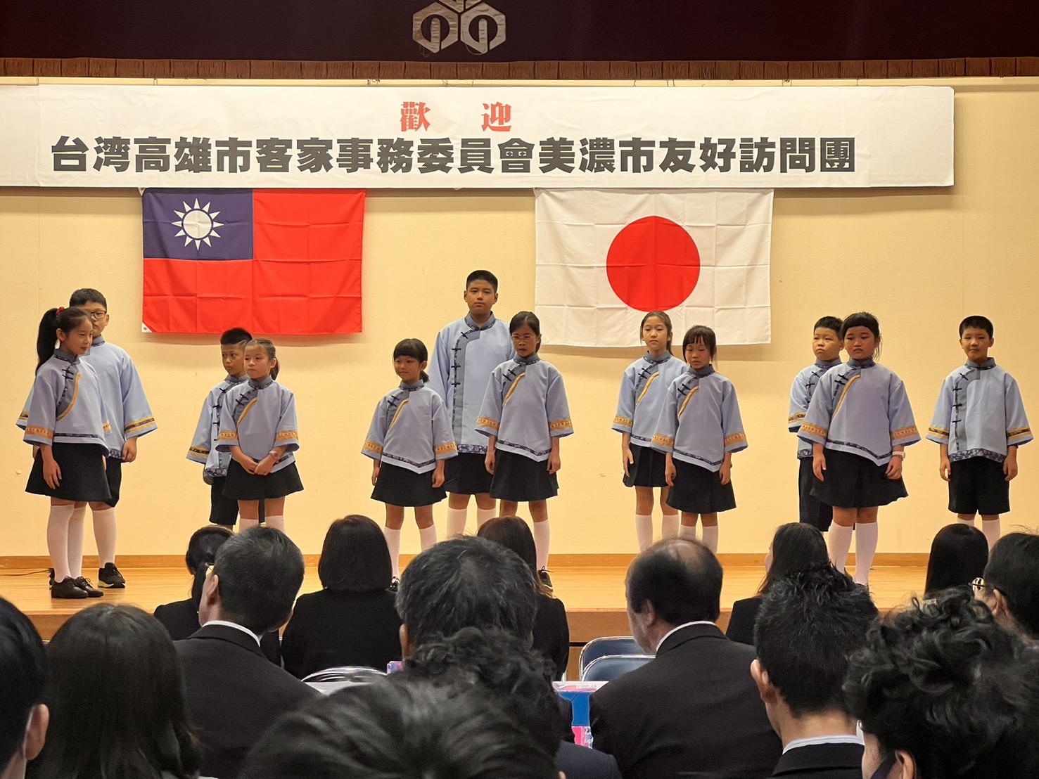 高雄市客家兒童合唱團赴日交流演出,昨(廿三)日下午拜會日本岐阜縣美濃市役所,美濃市長武藤鉄弘、市議會議長山口育男、多名市議員及市役所員工近百人,從市役所門口列隊一路鼓掌歡迎高雄市客委會訪問團,會場懸掛台日國旗,表達兩國堅強友誼,現場氣氛讓團員們十分感動。合唱團隨後獻唱「茶頂山个風」,聽到孩子們悅耳動聽歌聲,日本友人也跟著節奏拍手,現場洋溢歡樂氣氛。高雄市客委會主委楊瑞霞代表市長陳其邁致贈高市觀光吉祥物「高雄熊」及九十九個客家藍衫吊飾給日本美濃,特邀日和紙燈明年在台灣元宵燈會展完後能移到高雄美濃老街展出,帶動兩地工藝交流,更深化雙方人民情誼。