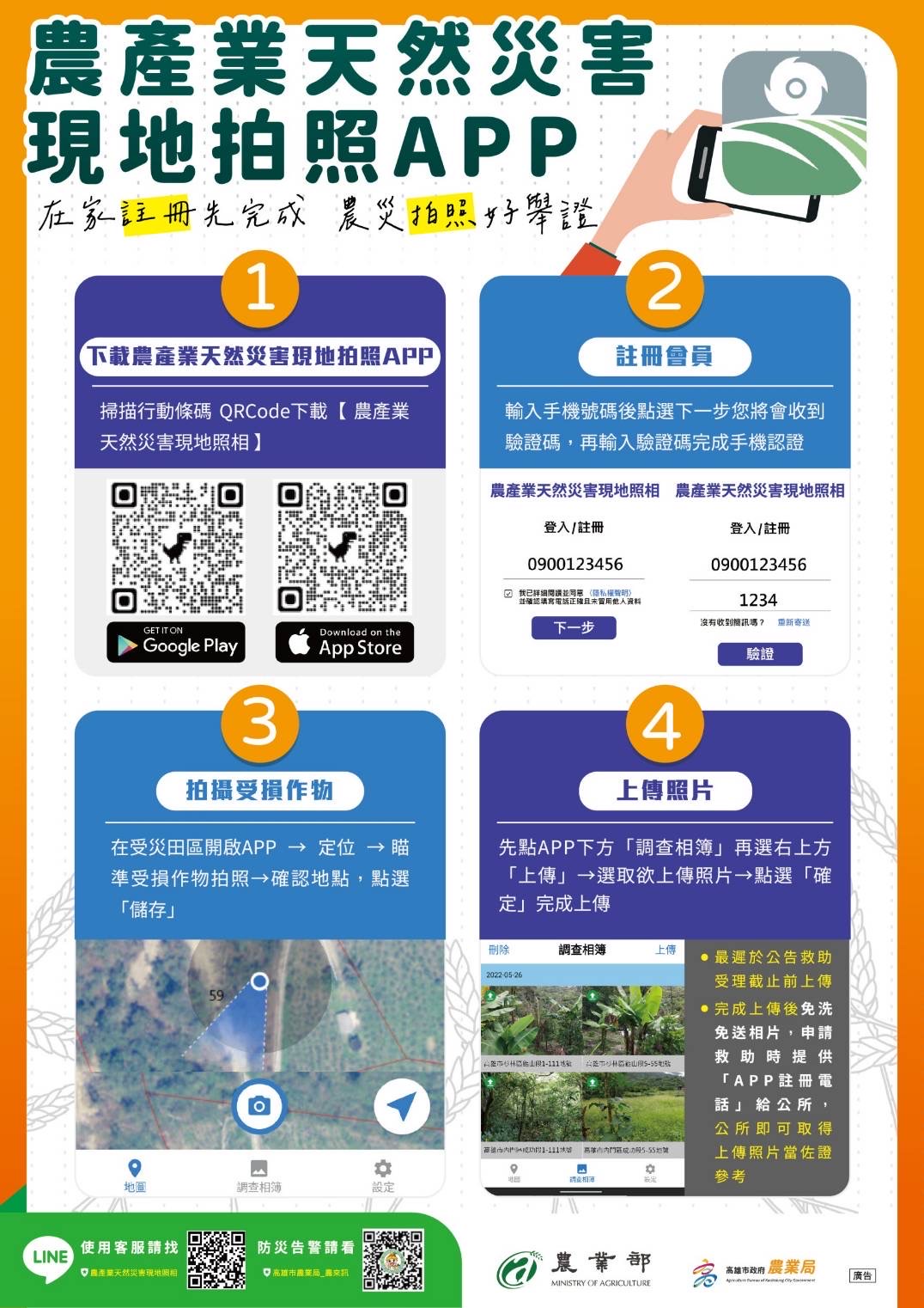 市長及市府團隊也連日到內門、梓官及燕巢各產區瞭解農損,因本次災損嚴重,市長也指示農業局向中央爭取擴大免勘查救助項目,加速救助金核撥。農業部也於昨日核定高雄種植非溫室種植的芭樂、香蕉、木瓜、蔬菜全品項以及西瓜(中大果期)跟香瓜(果期),申請救助農民如有產銷履歷、天然災害救助、農業保險、申辦綠色環境給付計畫等客觀種植文件或使用農業部「農業天然災害現地照相APP」拍攝災損照片,經公所確認即可免除現勘程序,加速救助作業,協助農民儘速復耕。