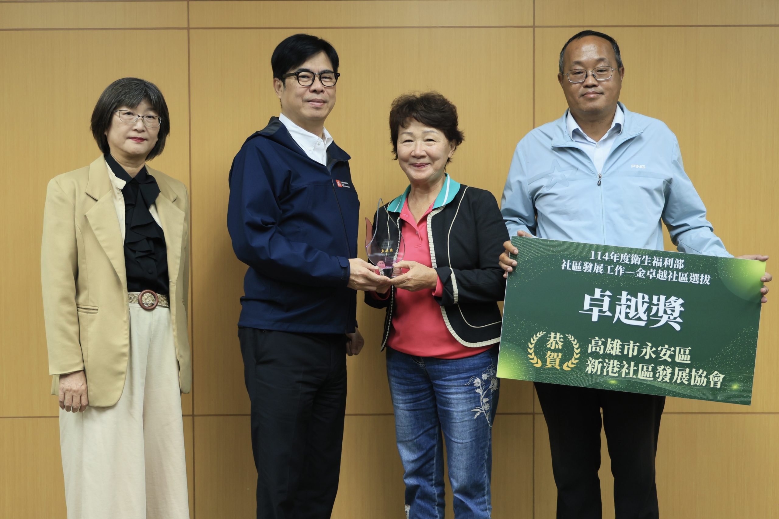 衛生福利部「114年度全國社區發展金卓越社區選拔」高雄市7個參選社區全數獲獎,展現社區多元發展的深厚能量。獲獎社區包含大寮區中庄社區獲得銅質卓越獎,永安區新港社區及旗山區糖廠社區獲得卓越獎,茂林區萬山社區及旗山區廣福社區獲得優等獎,前鎮區興邦社區及湖內區湖庄社區獲得甲等獎,市府於今(16)日市政會議予以表揚,由市長陳其邁親自頒發獎座,感謝得獎社區以亮眼成果為高雄爭光。