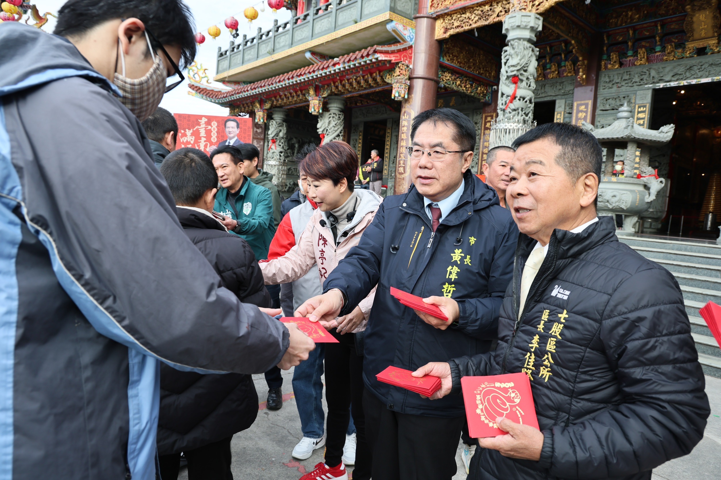 市長黃偉哲表示,很高興在過年期間來到各地廟宇參拜,祈求國泰民安、風調雨順,臺南市運昌隆,同時也向所有在場市民朋友提前拜年,祝福大家「蛇宓隆發 大吉大利」。
