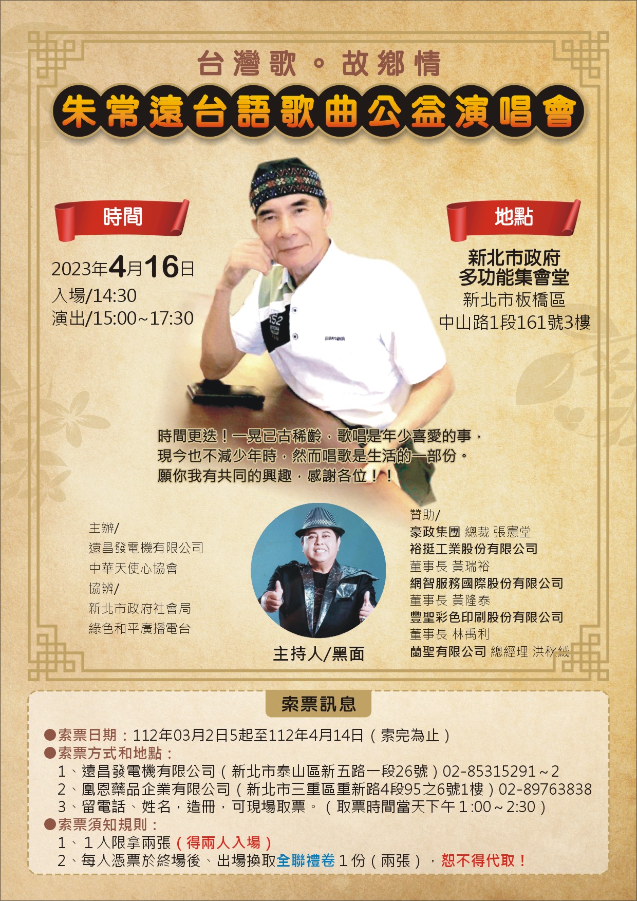 靜極又思動,遠昌發電機董事長朱常遠天生就喜歡哼哼唱唱,出身阿蓮的藝人黃西田更是他的學習偶像,不管是唱腔、台風、選曲,都以黃西田為榜樣,也唱出他個人的風格,經過企業界友人裕挺金屬股份有限公司董事長黃瑞裕及豪政集團總裁張憲堂,從中慫恿舉辦一場個人公益演唱會,加上朱常遠童年腦海裡就藏著一個歌星夢,於是在因緣俱足下,決定整裝下山於4月16日在新北市政府多功能集會堂,盛大舉辦一場「古早味ㄟ台灣歌金曲演唱會」,以饗鄉親歌友。