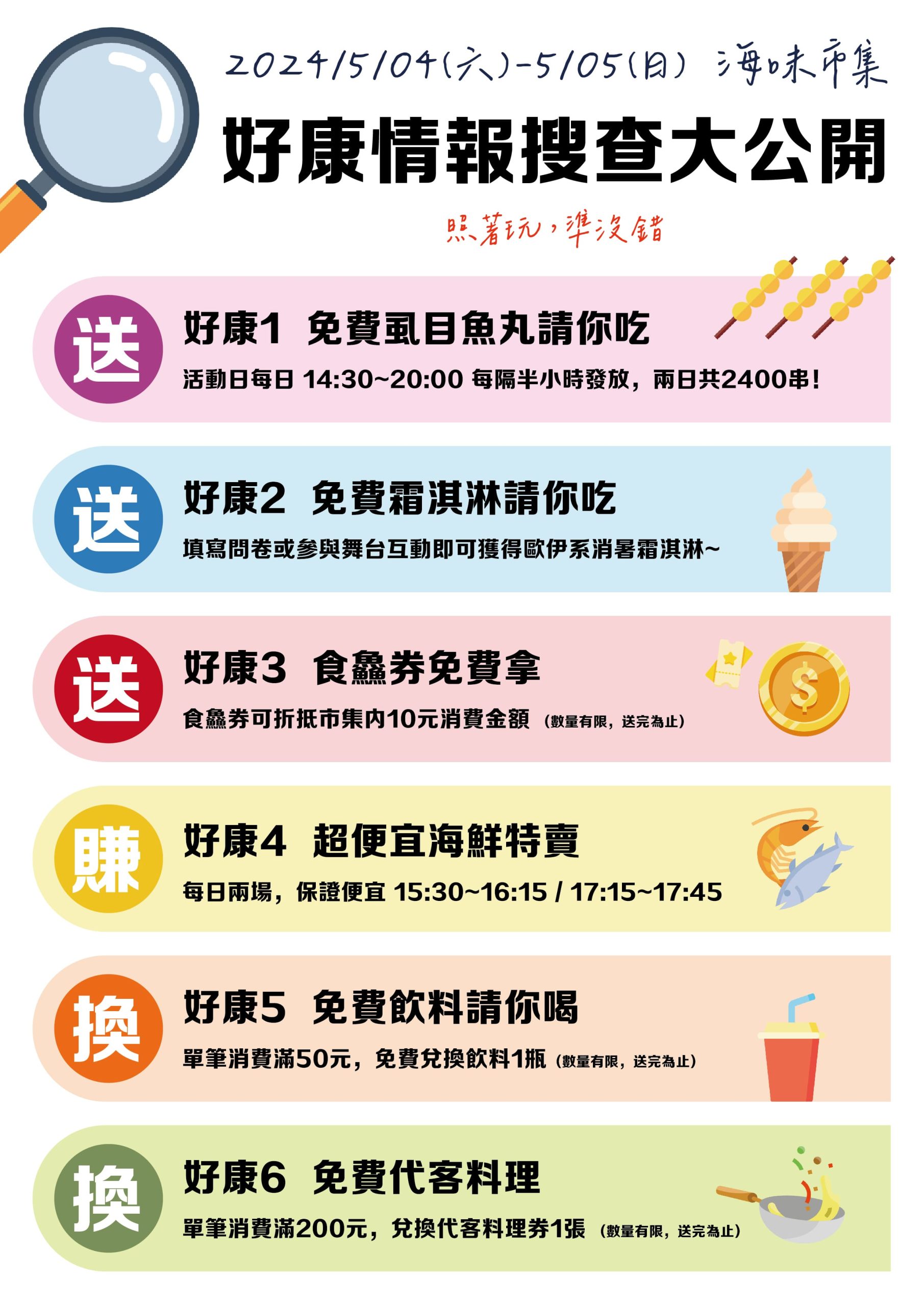 海味市集本次準備了「超便宜海鮮特賣」虱目魚肚2片只要99元!大鱸魚100元,鯖魚片4片100元,龍虎石斑魚250元等各種新鮮海味、「免費虱目魚丸串」試吃活動、「免費霜淇淋」兌換(填寫活動問卷或是現場拍照打卡互動)、「10元食鱻券」於活動現場及旗津輪渡站發放,可於市集消費折抵10元,另外還有提供滿額兌換券,單筆消費滿50元可兌換「免費飲料一瓶」,讓您輕鬆消暑一下。單筆消費滿200元,還可獲得「代客料理服務」,以上優惠好康數量有限,換完為止,早來早搶早享受!詳情可上「高雄海味地圖-高雄市政府海洋局」臉書查詢(https://pse.is/5vqaea)。